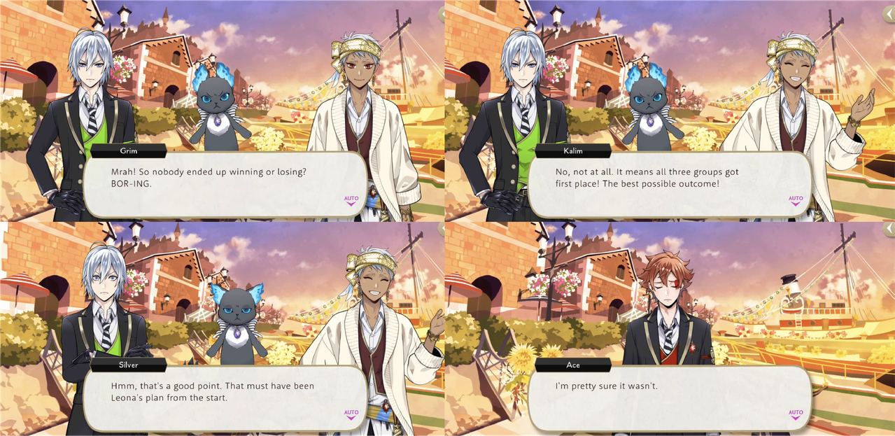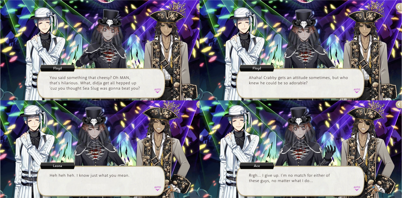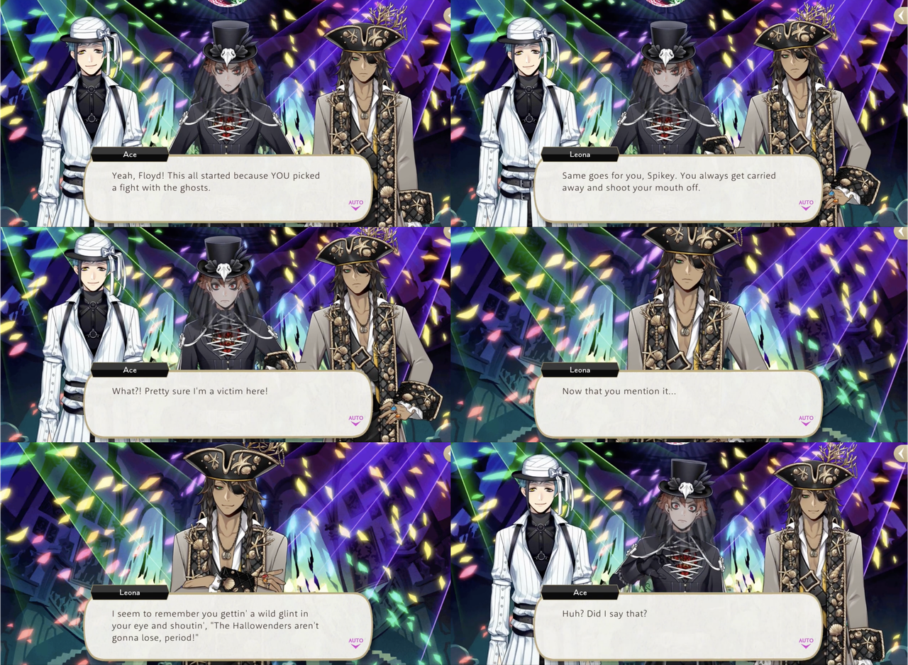At the conclusion of the event Leona teases Ace about his battle cry against Malleus (“The Hallowenders aren’t gonna lose, period!”). Floyd says, “Crabby gets an attitude sometimes, but who knew he could be so adorable?,” and Leona agrees, saying, “I know just what you mean.”