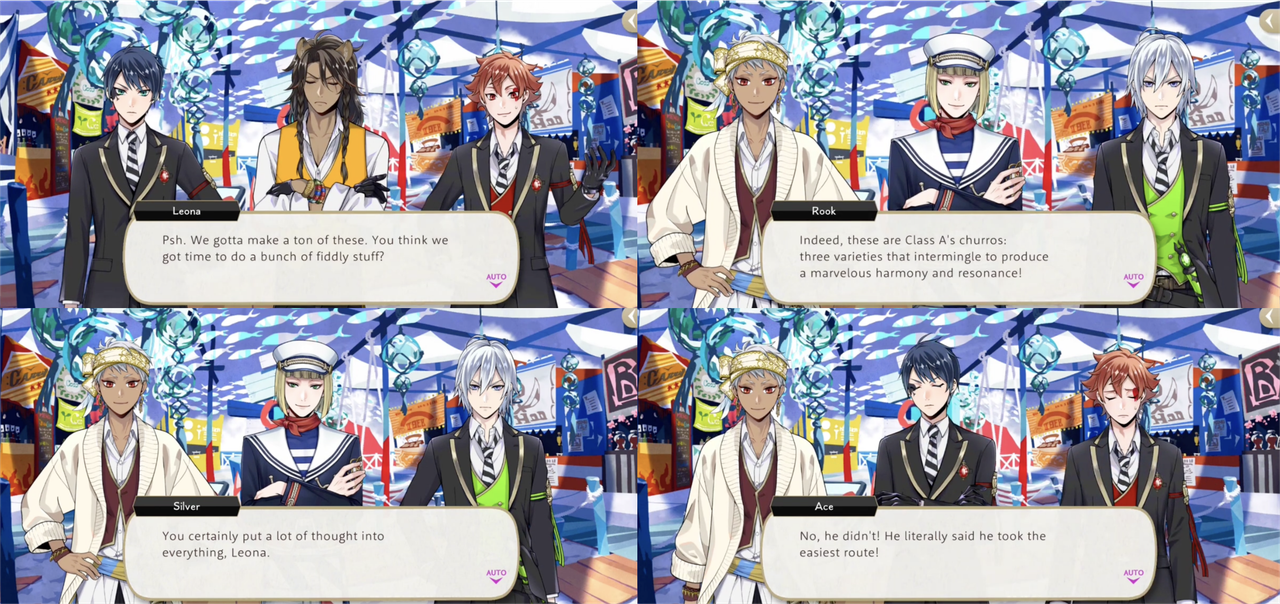 During the Port Fest event the churro stands sells three different flavors, one for each of the three grades, and while characters like Ace and Kalim try to compete over who sells the most Leona has them sell packs with all three together starting from midday, which proves popular but also results in all three flavors selling out simultaneously (Leona: “That stupid competition didn’t even matter. It was way more important for us to sell out and close up shop”).