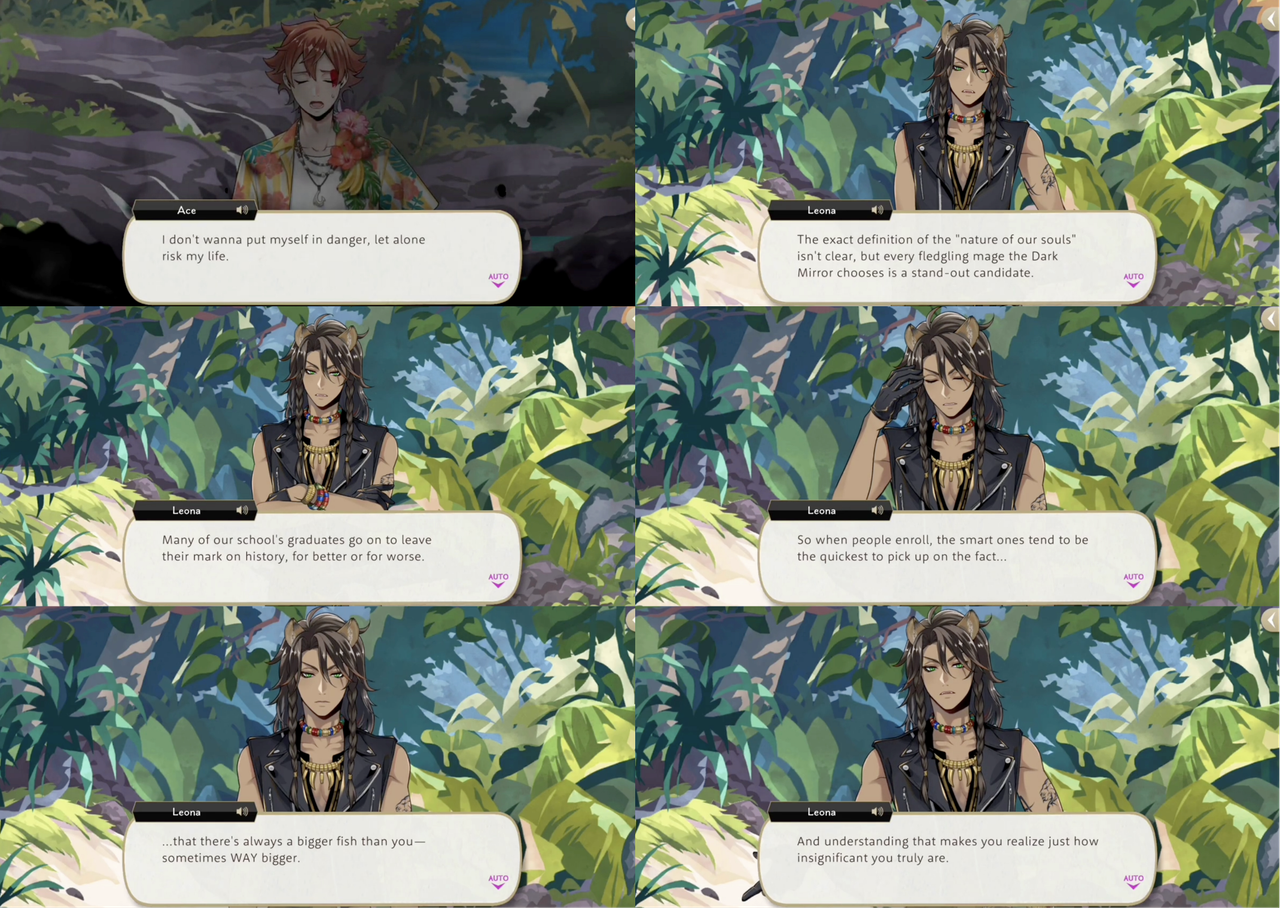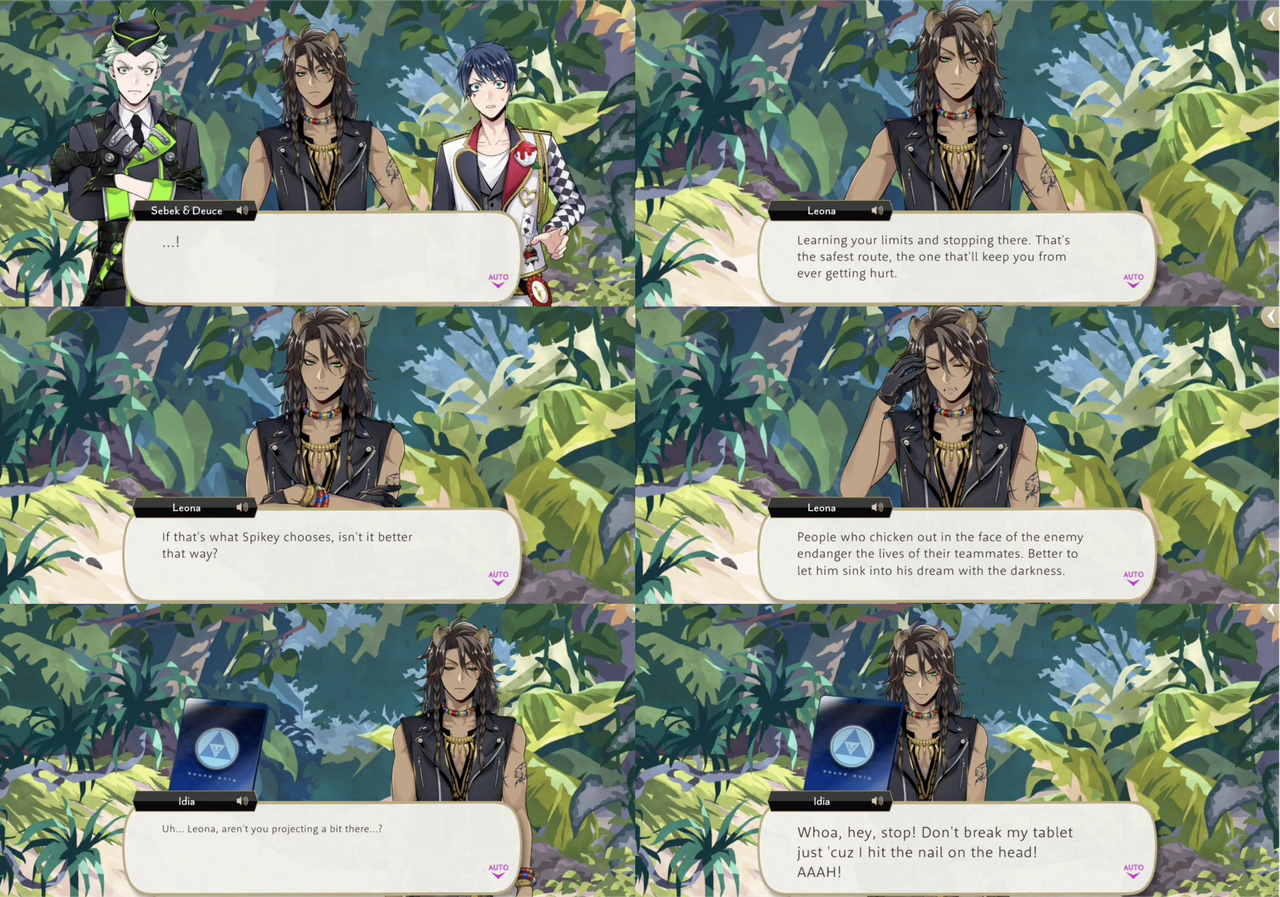 Ace is not impressed, however, when Leona assigns himself to the role of guard while the rest of their group searches for mirror fragments, saying that Leona “skipping out on the actual work” is “typical,” and, “Aren’t you supposed to be a housewarden? How about showin’ some leadership?”