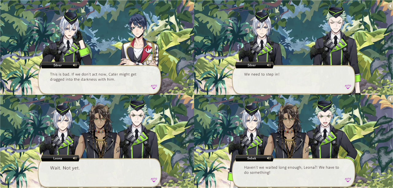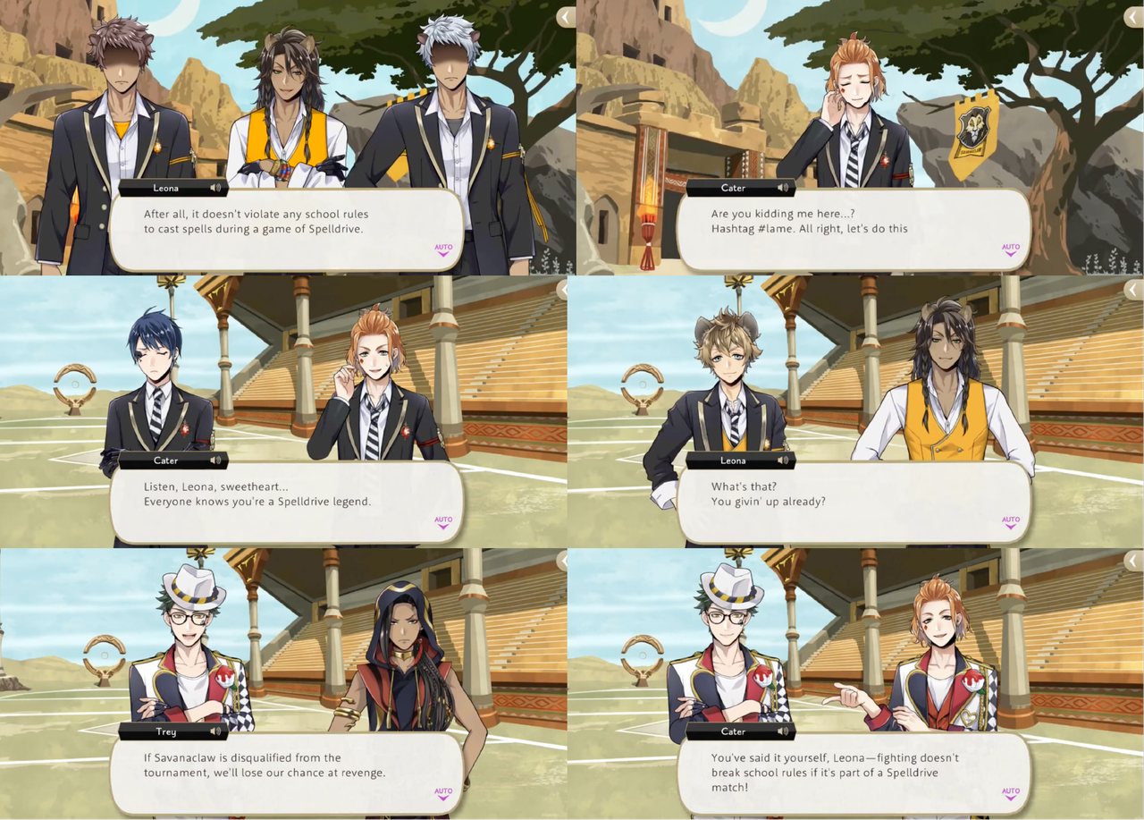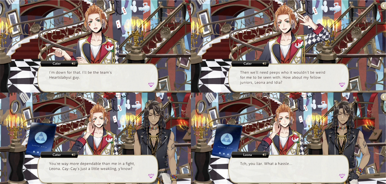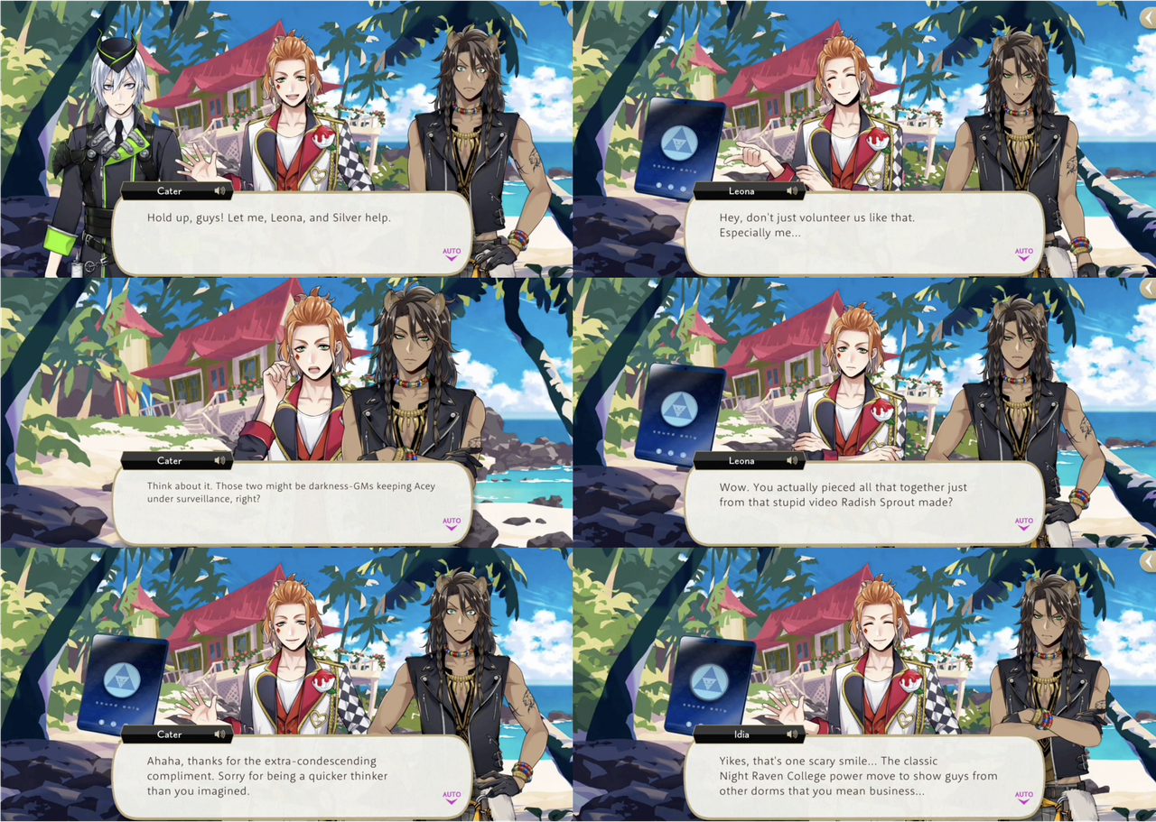 Cater is not pleased by Leona and Idia giving such ideas to Deuce, saying that he and Trey are not “the kind of nefarious schemers that would take advantage of younger students.” Leona is unconvinced.