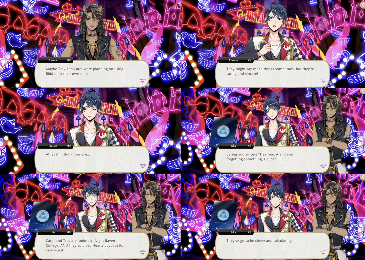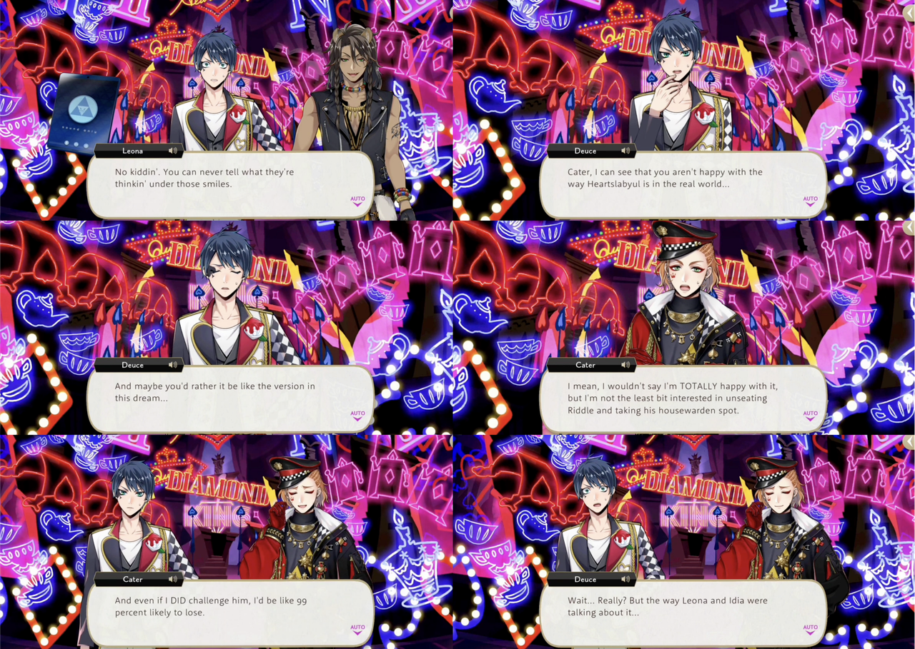During Cater’s dream Leona and Idia guess that Trey and Cater had possibly been intending upon using Riddle behind the scenes after he took over as housewarden. Deuce insists they are both “caring and sincere” (“At least…I think they are…”), and Leona responds that as 3rd-year NRC students who survived Heartslabyul at its worst, “They’ve gotta be clever and calculating.”