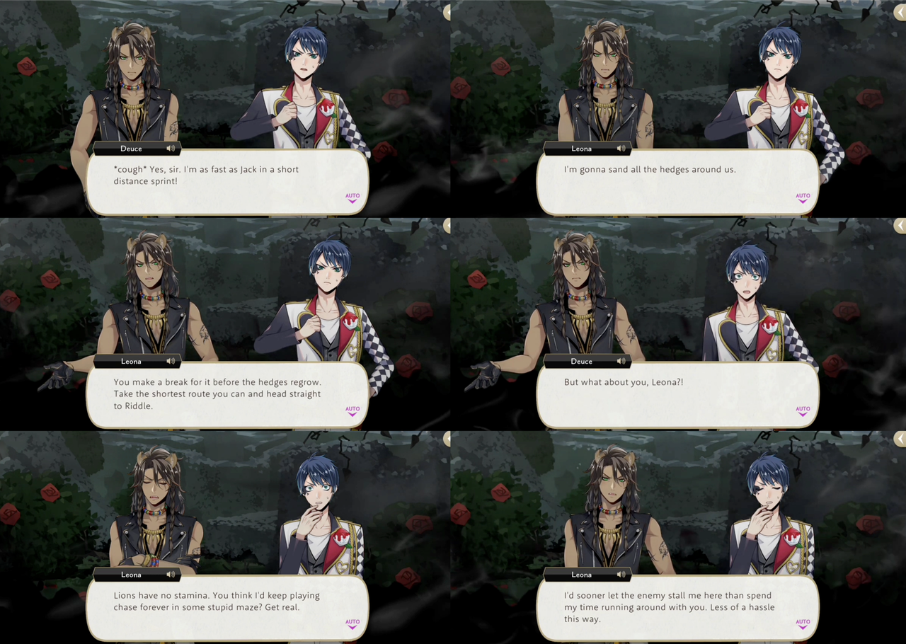 When Deuce is hesitant about being alone Leona assures him, “You’re a Heartslabyul student. You should know what routes the other guys would take, right?,” successfully convincing Deuce to escape on his own (Leona: “I can appreciate someone who doesn’t waste time waffling”).