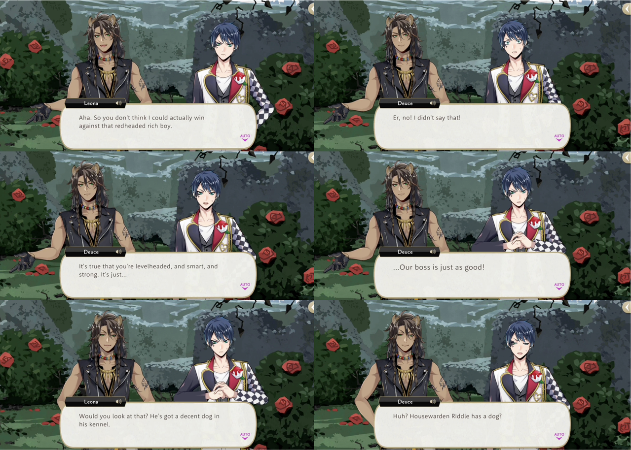 Deuce responds, “It’s true that you’re levelheaded, and smart, and strong. It’s just…our boss is just as good!” Leona replies, “Would you look at that? He’s got a decent dog in his kennel.”(Deuce: “Housewarden Riddle has a dog?”)
