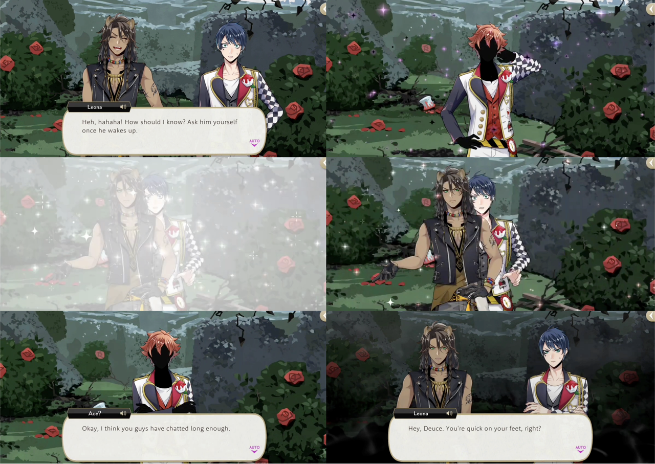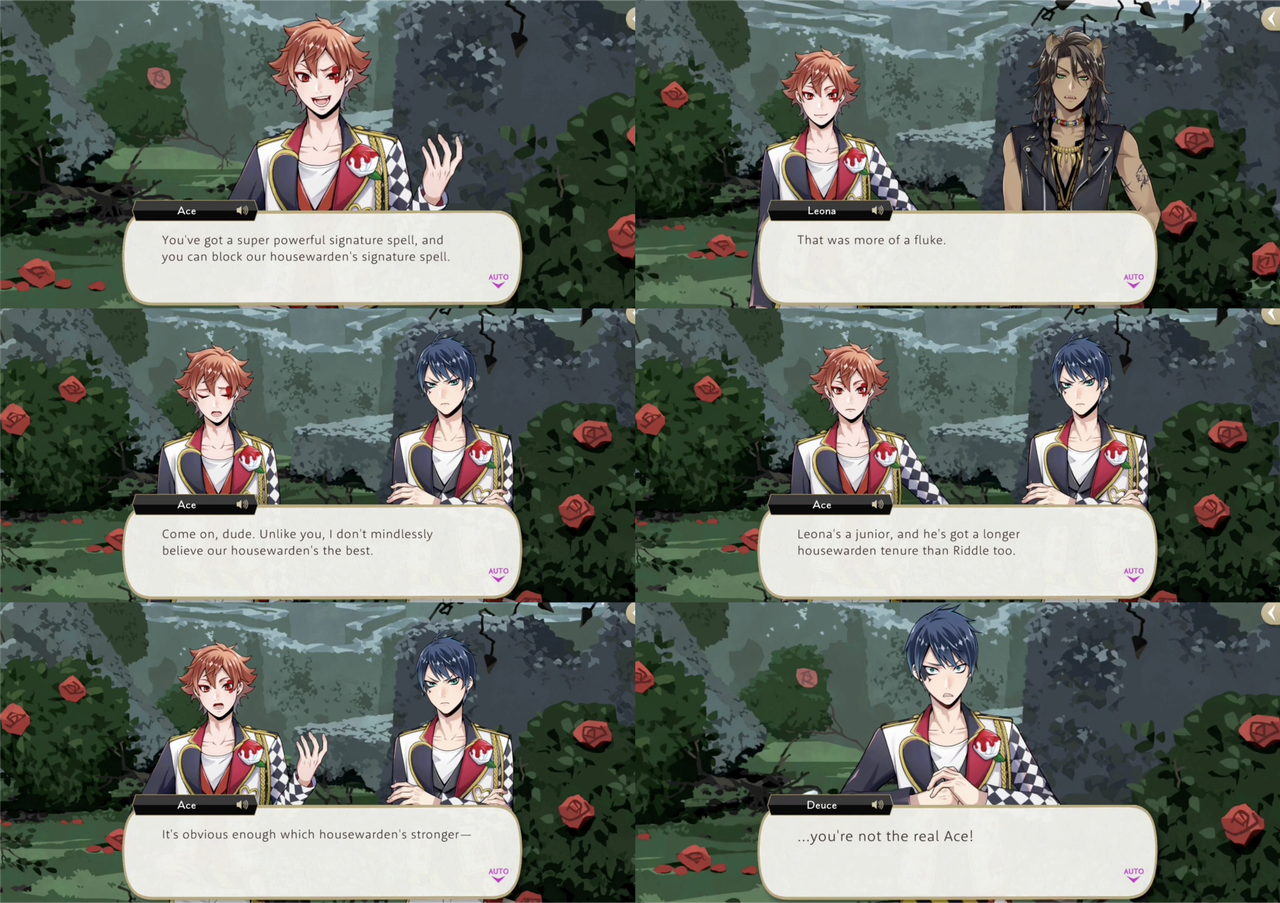Deuce and Leona overlap again in Riddle’s dream, where Deuce identifies a dream-Ace by how he praises Leona at Riddle’s expense (Dream-Ace: “You’ve got a super powerful signature spell, and you can block our housewarden’s signature spell.” – Leona: “That was more of a fluke.”)