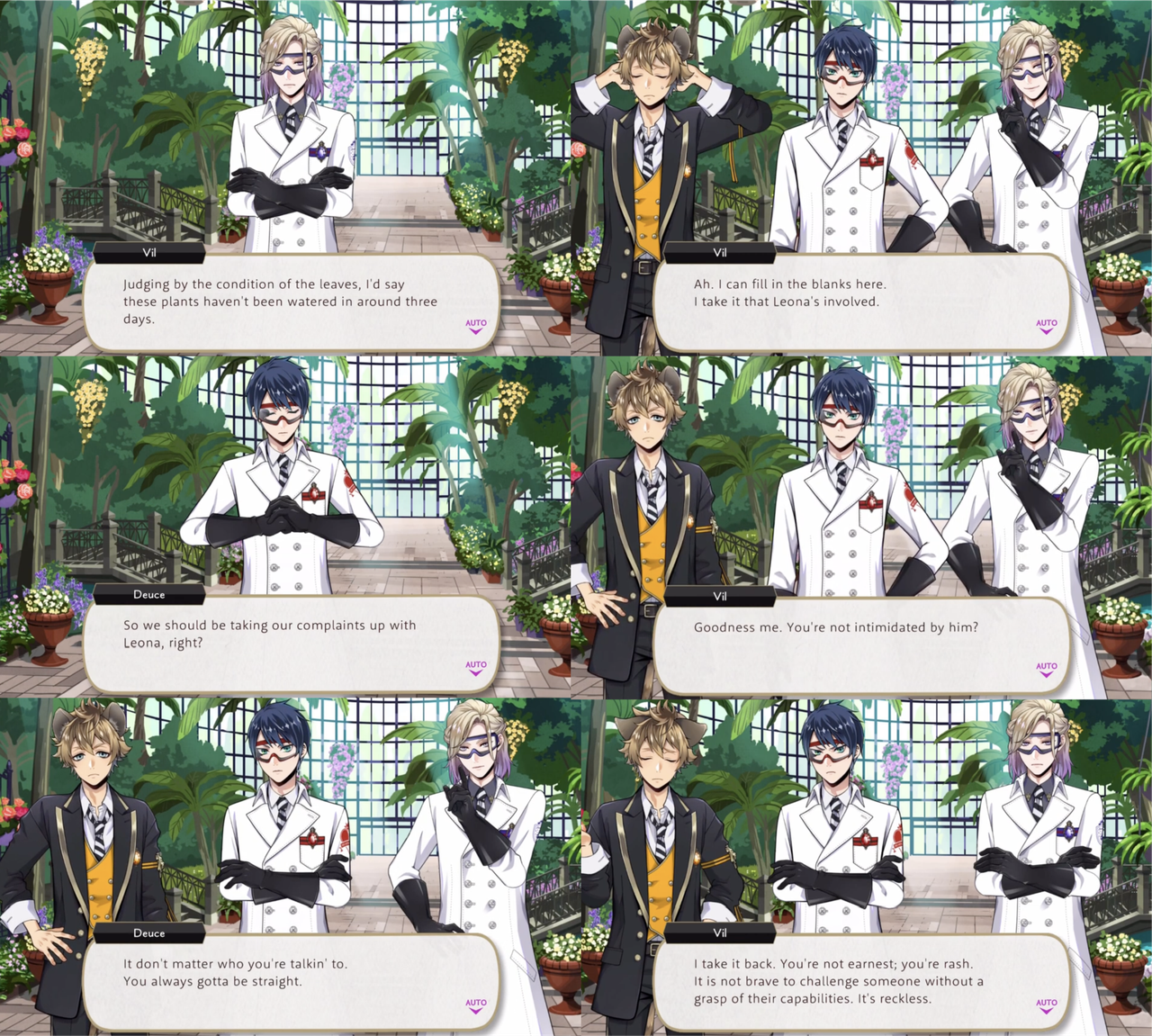 In an early vignette Vil seems impressed by how Deuce is not intimidated by Leona, but after he explains his reasoning of, “It don’t matter who you’re talkin’ to. You always gotta be straight,” Vil takes it back, saying “It is not brave to challenge someone without a grasp of their capabilities. It’s reckless.”