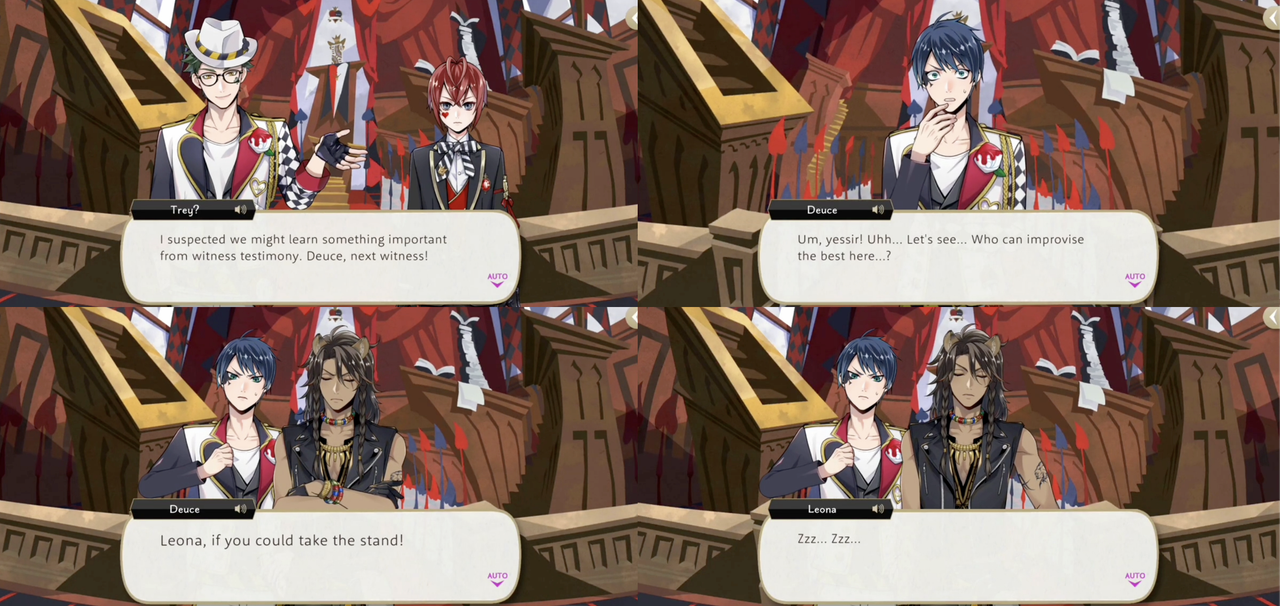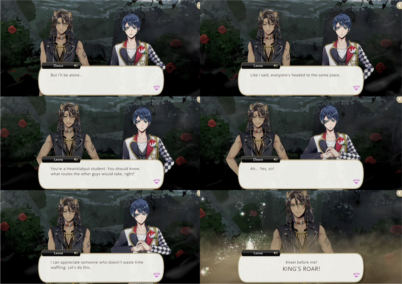 While nothing is described via dialogue, based on visuals it appears as though Leona physically shields Deuce from an attack by a dream-Ace. Leona then sends him off alone, claiming that “lions have no stamina” (though this may have been a lie to convince Deuce to leave him behind: Ruggie has said before that Leona has “got ridiculous magic reserves…and (his) stamina’s nuts, too”).