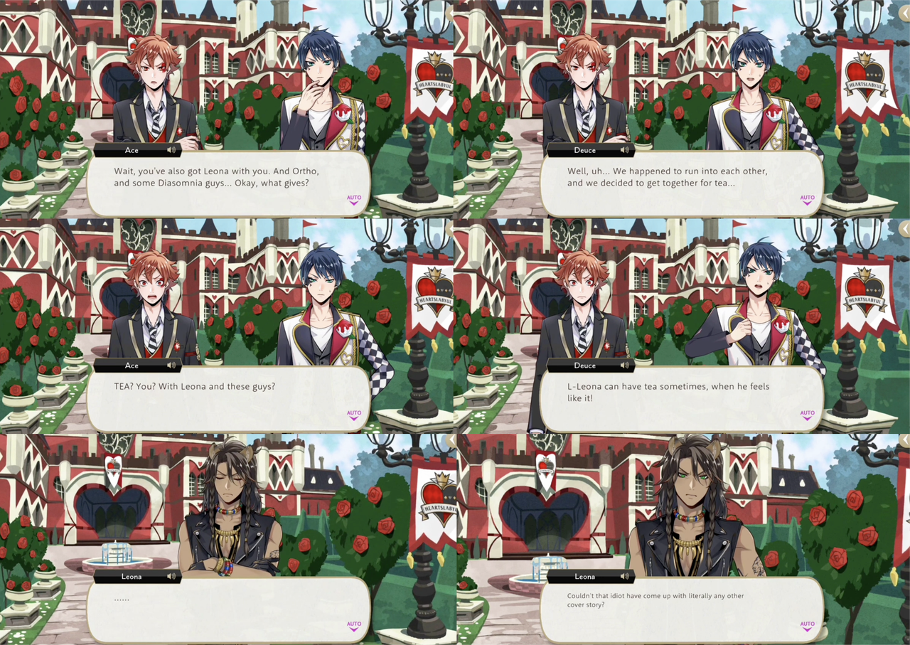 When a dream-Ace asks Deuce about being accompanied by Leona in Cater’s dream Deuce says they decided to get together for tea: “L-Leona can have tea sometimes, when he feels like it!” Leona quietly asks, “Couldn’t that idiot have come up with literally any other cover story?”