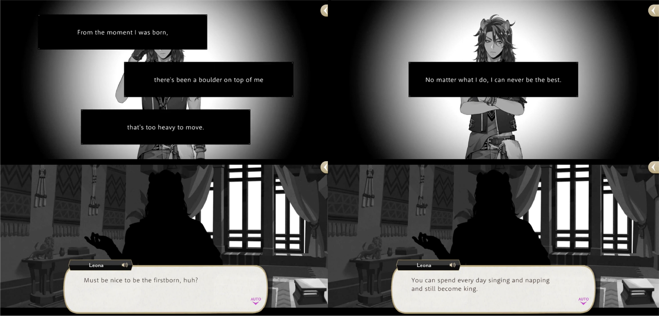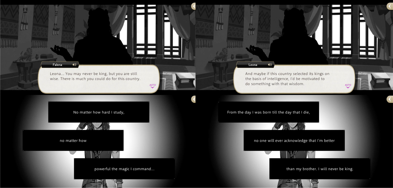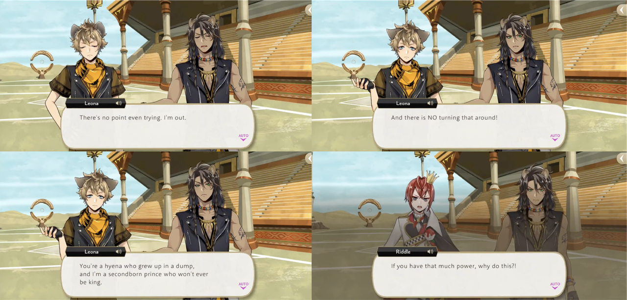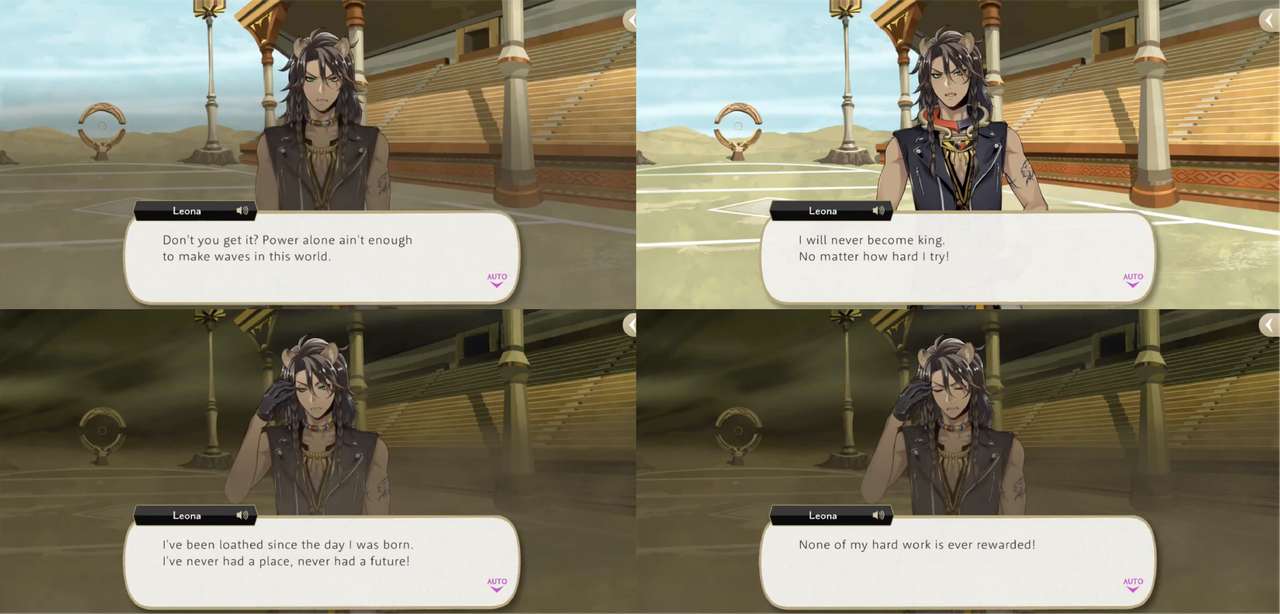This seems to be a significant part of Leona’s inner turmoil: born into a situation that will never get any better or any worse no matter what he does or doesn’t do, surrounded by people telling him to try while the person who has the only thing he wants has achieved it without having to try at all.