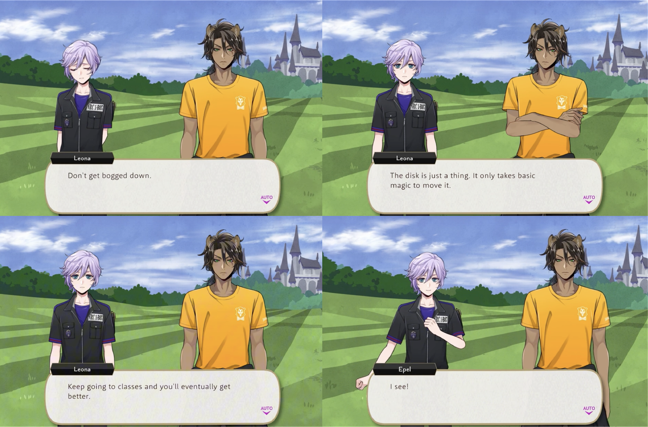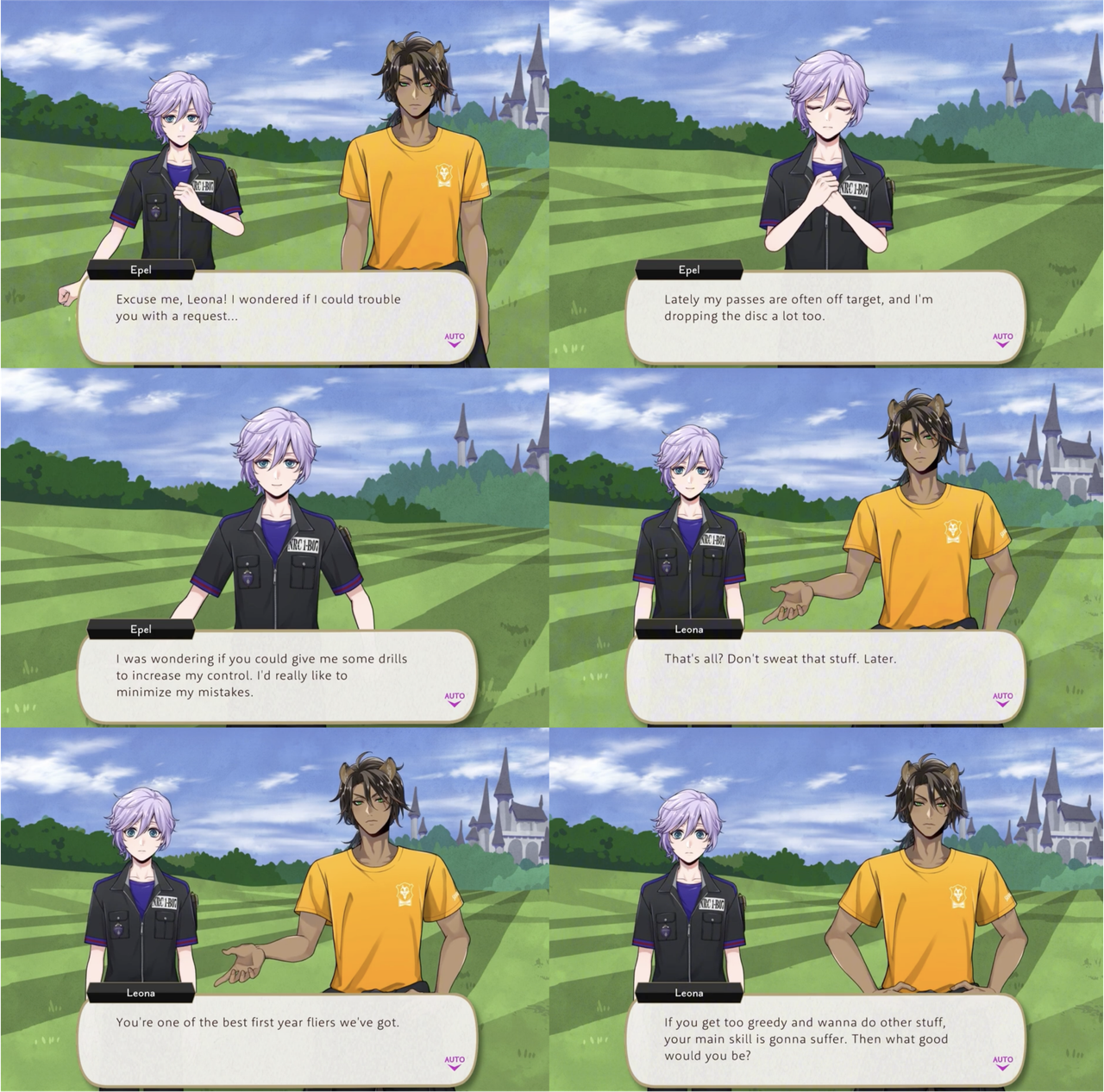 Epel says “Leona’s (spelldrive) advice is always so helpful! Just wish he was more active at practice to give it,” and we possibly get an example of this in a vignette where Epel asks for help with his passes and Leona responds, “Don’t sweat that stuff. Later.”
