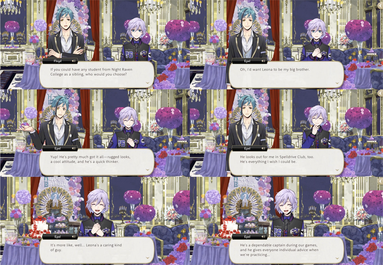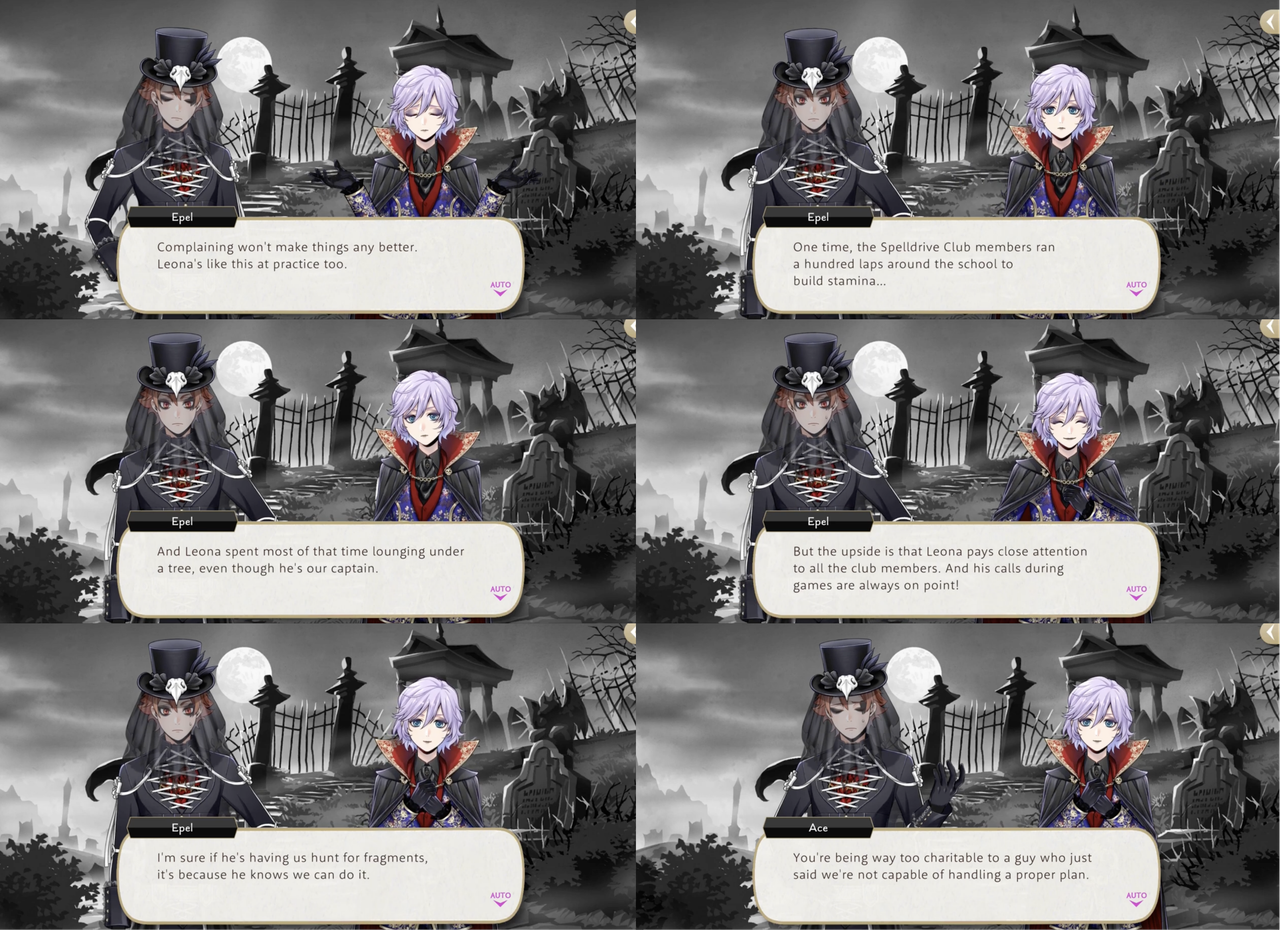 Epel tells Ace that complaining won’t make things better with Leona, and Leona acts the same way during spelldrive practice as he does during Spectral Soiree: “One time, the Spelldrive Club members ran a hundred laps around the school to build stamina…And Leona spent most of that time lounging under a tree, even though he’s our captain.”