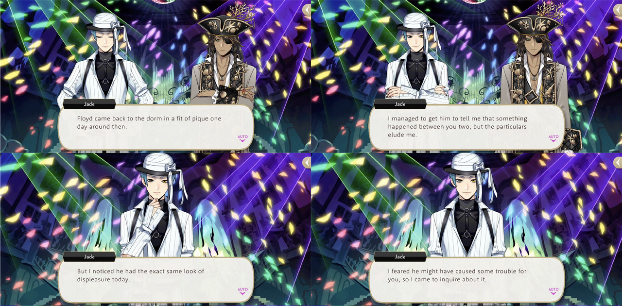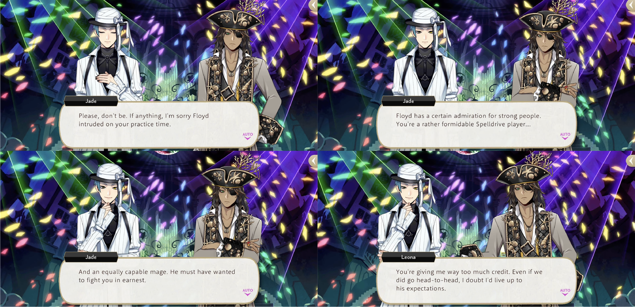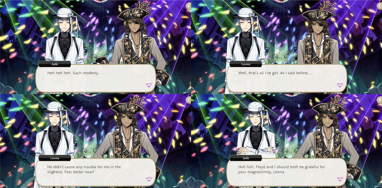 Jade explains, “Floyd has a certain admiration for strong people” but Leona responds, “I doubt l’d live up to his expectations,” and, “He didn’t cause any trouble for me in the slightest.” Jade says, “Floyd and I should both be grateful for your magnanimity.”
