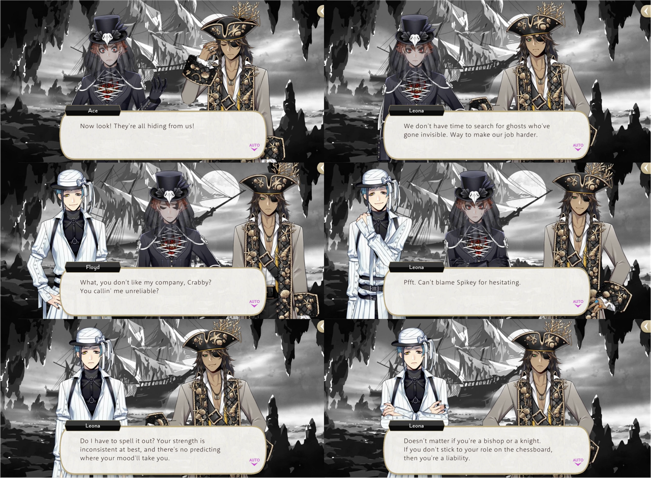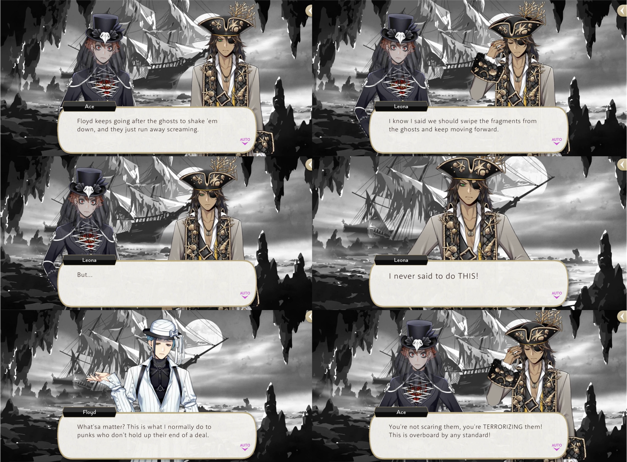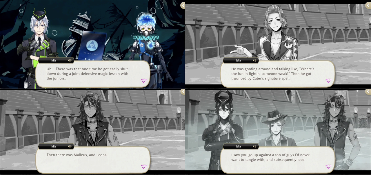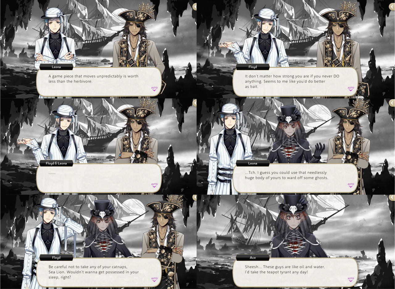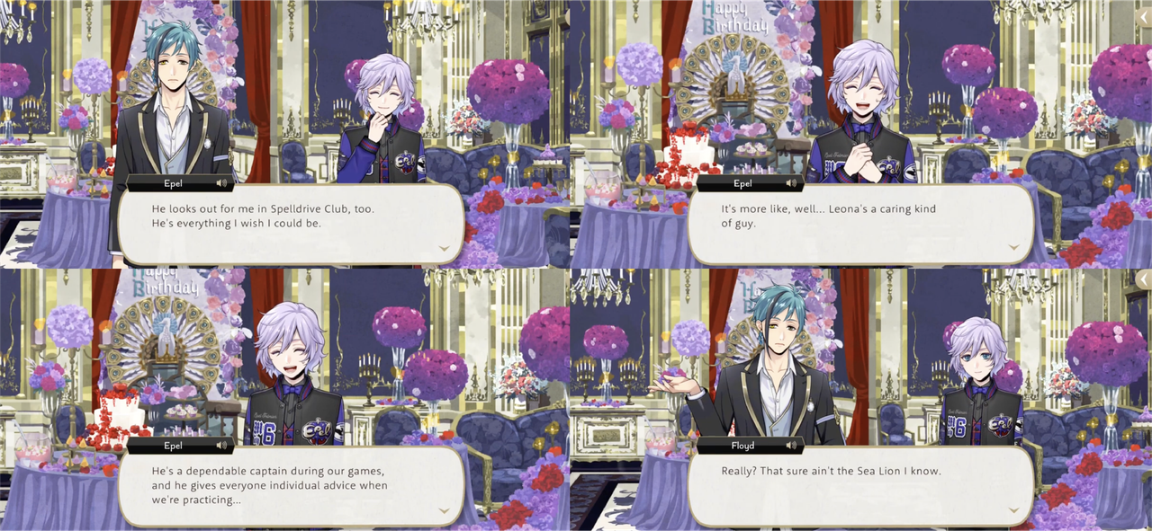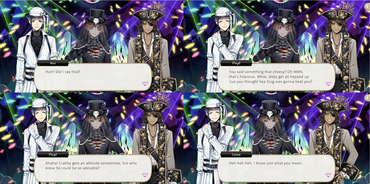 Ace agrees with Leona, blaming Floyd for terrorizing the ghosts in the first place, but Leona and Floyd come together to tease Ace about the dramatic battle line he used when confronting Malleus (Floyd: “Crabby gets an attitude sometimes, but who knew he could be so adorable?” – Leona: “I know just what you mean.”)