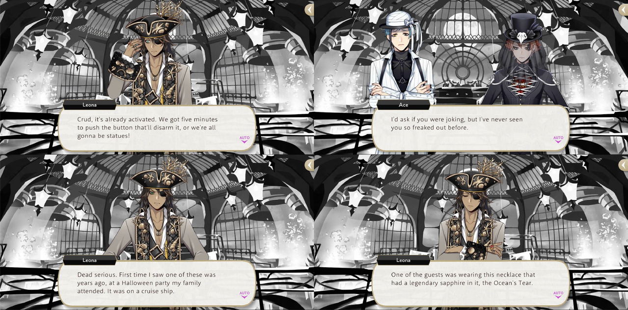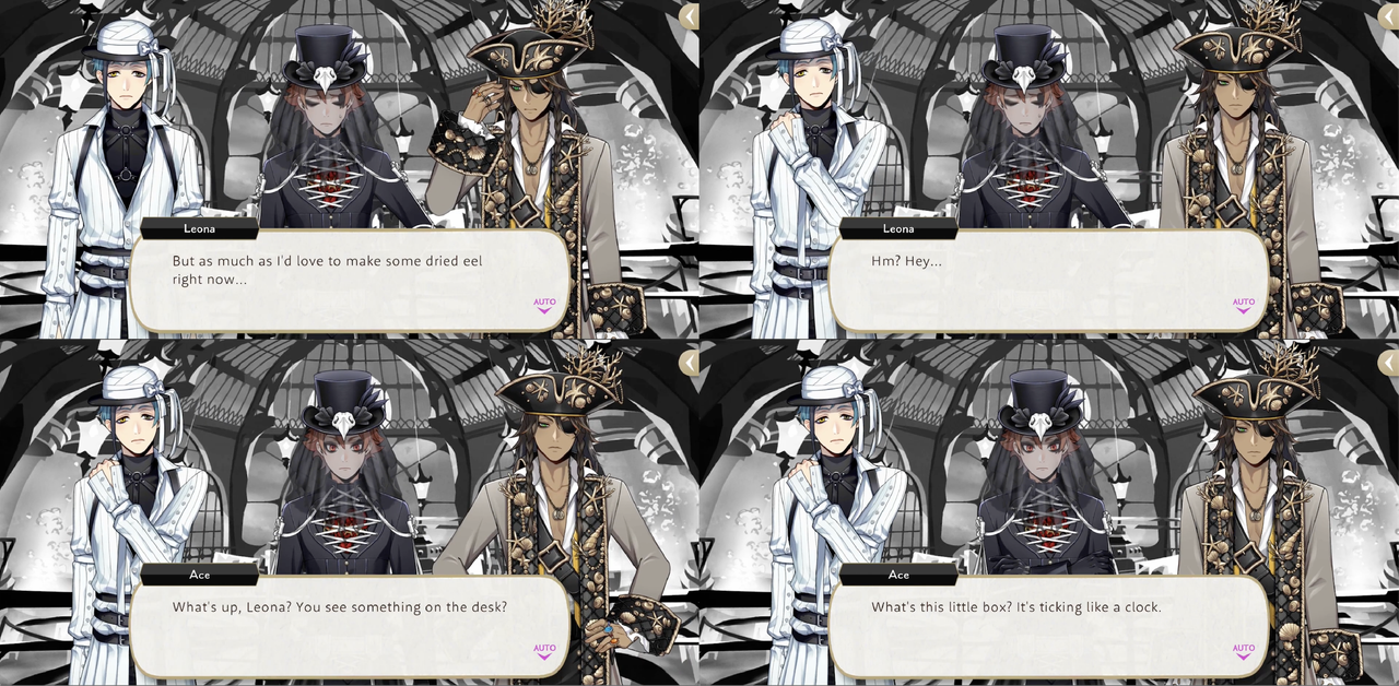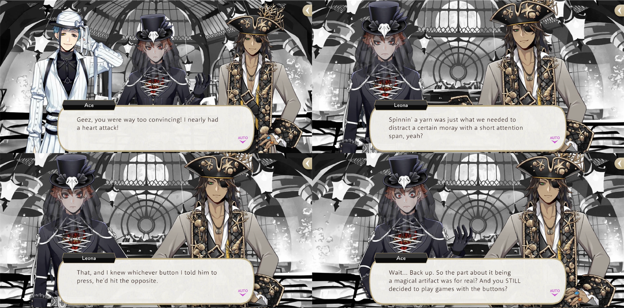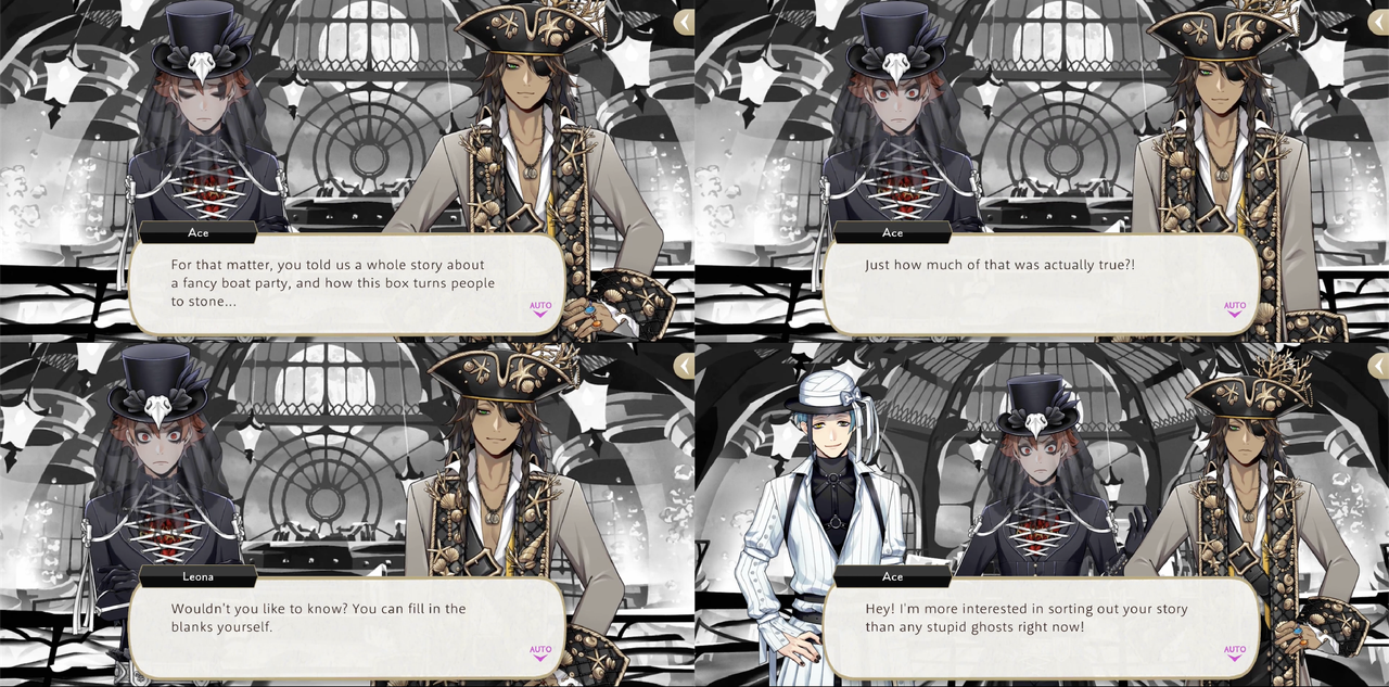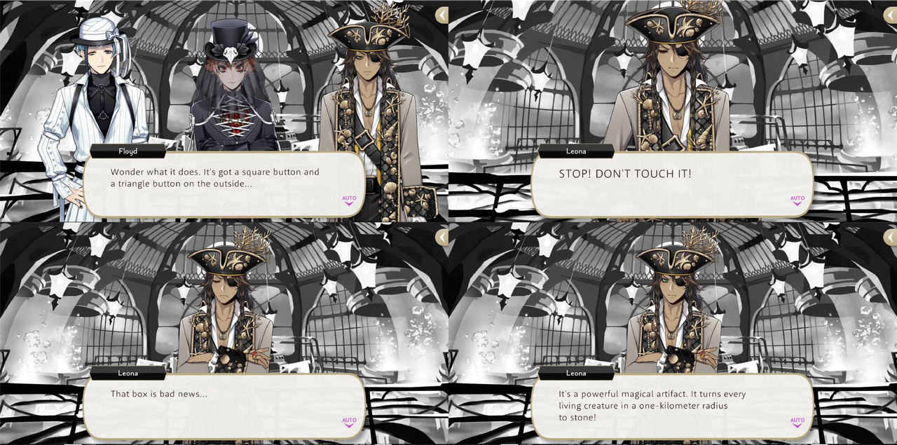 Ace asks, “So the part about it being a magical artifact was for real? And you STILL decided to play games with the buttons? For that matter, you told us a whole story about a fancy boat party, and how this box turns people to stone…just how much of that was actually true?!,” but Leona refuses to answer.