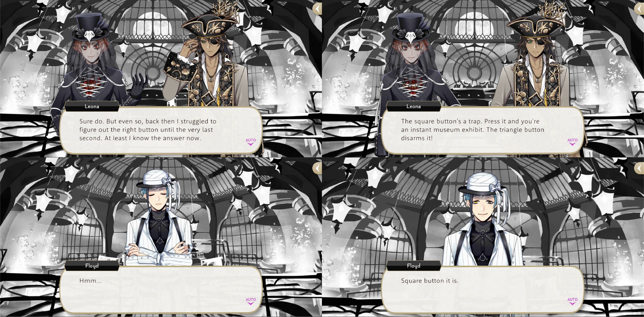 Ace asks if Leona gets “cool special training” as royalty, which Leona confirms, though even he struggled to figure out the right button until the last second. Leona says, “The square button is a trap…the triangle button disarms it,” and Floyd chooses to press the square button.