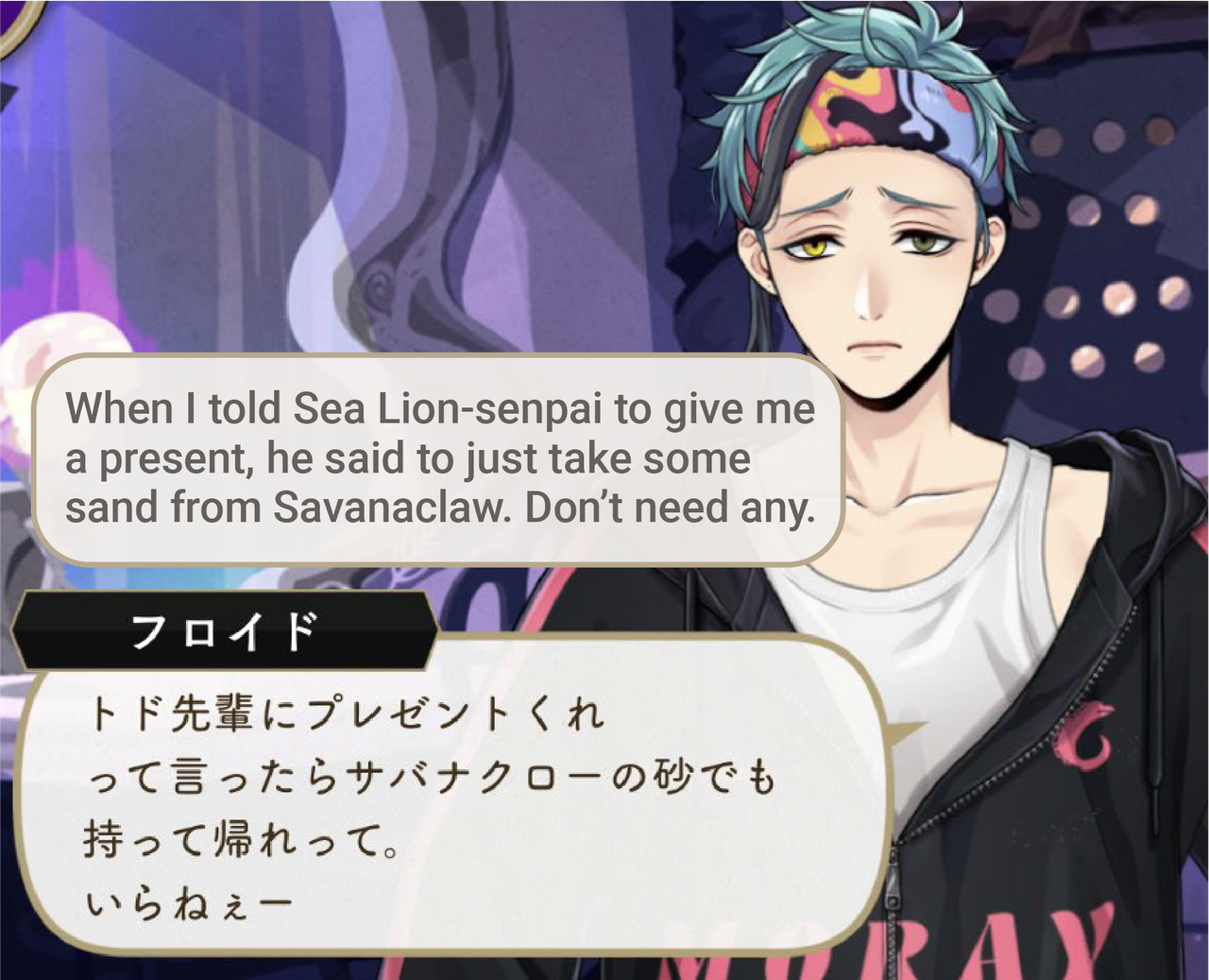 Floyd says that he once told Leona to give him a birthday present and Leona told him to take home sand from Savanaclaw.