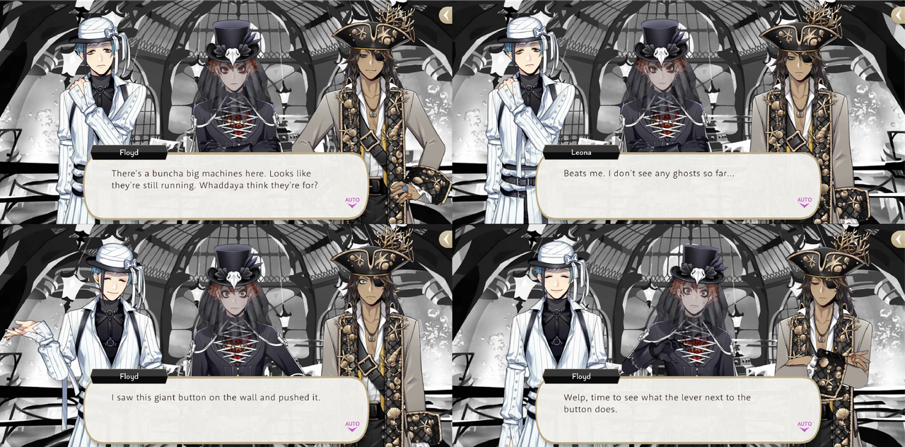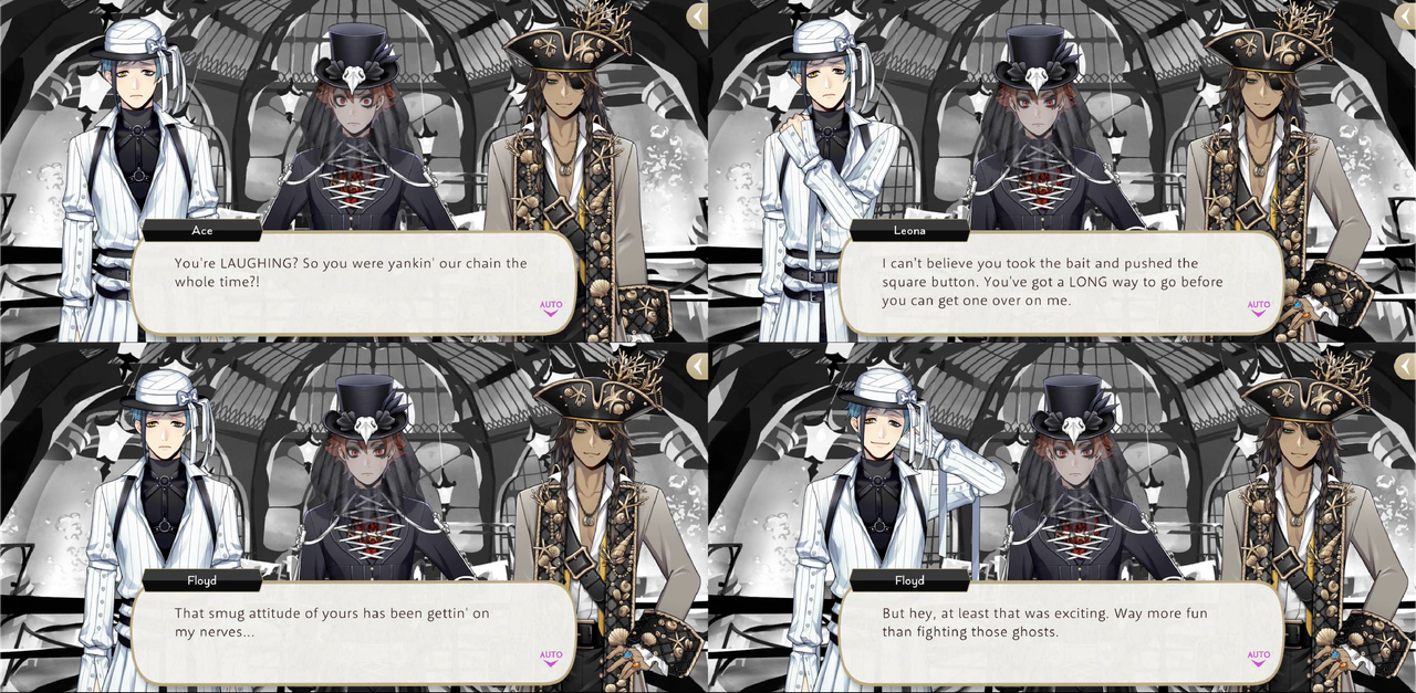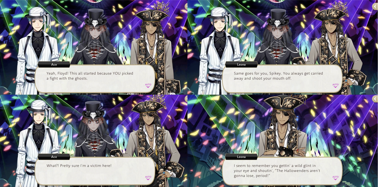 Leona and Floyd are in a group together with Ace during Spectral Soiree, where Floyd chooses to take mirror fragments from ghosts by terrorizing them (“This is what I normally do to punks who don’t hold up their end of a deal”), resulting in the ghosts going invisible, frustrating Leona.