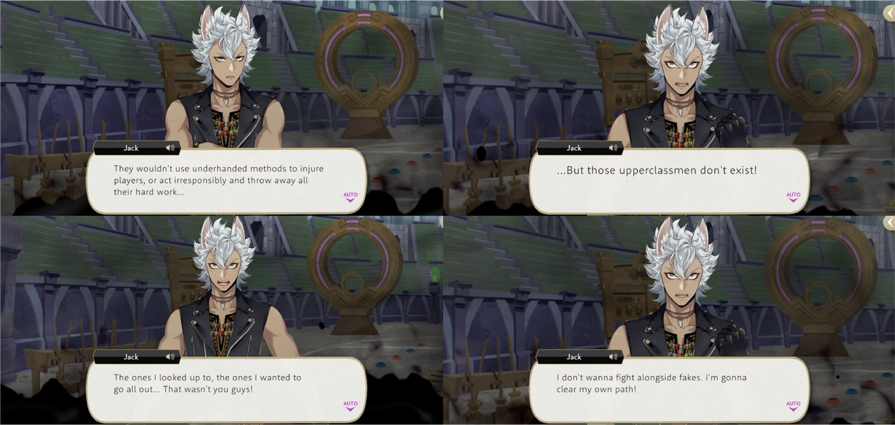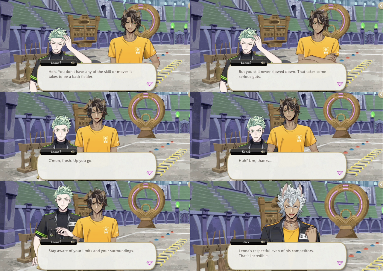 Dream-Leona still calls Jack out for having poor technical skills, but he also goes to Sebek’s aid after he ends up outside the playing field, saying, “You don’t have any of the skill or moves it takes to be a back fielder. But you still never slowed down. That takes some serious guts,” and helping him to his feet. (Jack: “Leona’s respectful even of his competitors. That’s incredible.”)