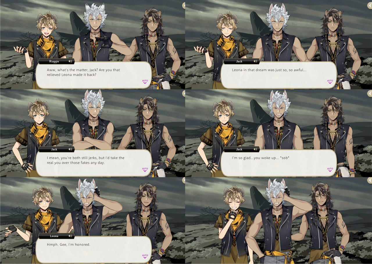 After Leona escapes the abyss Jack begins to cry, saying that, while Leona and Ruggie are both still jerks, he prefers the real them over fakes,” and he is “so glad (they) woke up.”