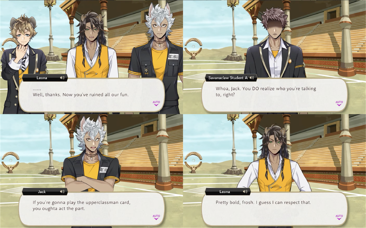 When Jack stands up to Leona early in Book 2, calling out the “disgusting spectacle” that is the practice spelldrive match against Cater, Ace, Deuce and Grim, Leona responds, “Pretty bold, frosh. I guess I can respect that,” and relents.