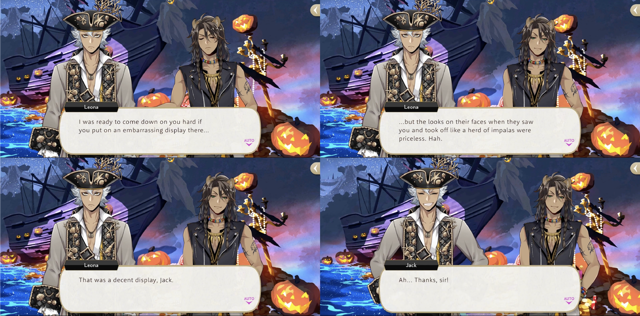 Jack seems pleased when Leona compliments his idea for Halloween, and even moreso when he compliments Jack’s successful strategy for scaring off Maficam Monsters. When Leona compliments him at the conclusion of Port Fest, Jack is left momentarily speechless.