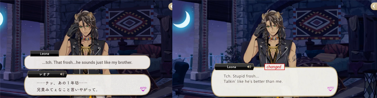 On EN Leona’s issue with Jack was rewritten as, “Tch. Stupid frosh…talkin’ like he’s better than me,” but that was not actually Leona’s problem with Jack at all: his problem was Jack reminding him of his older brother, but both references to Falena were removed from Book 2 of the EN game.