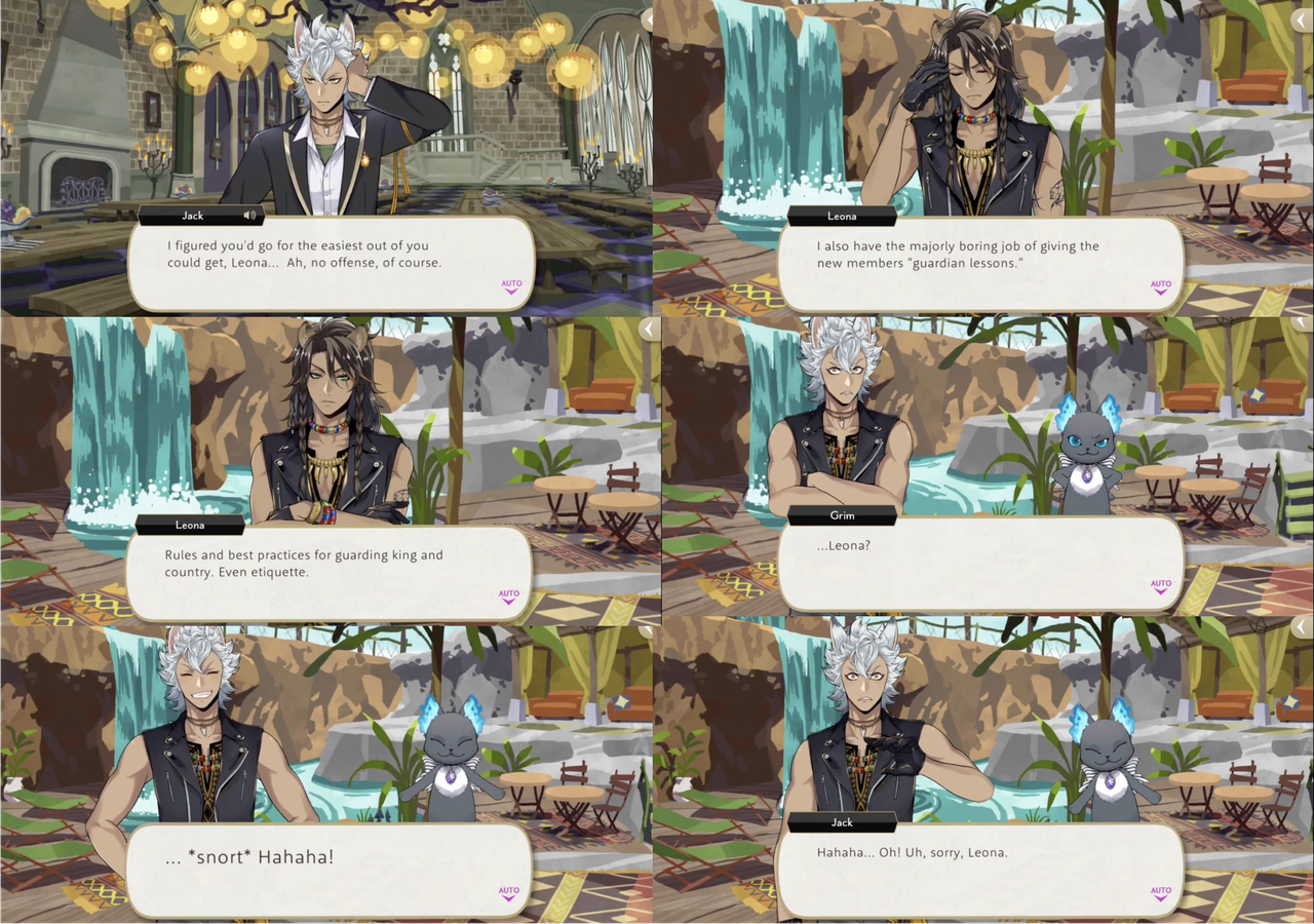 When Jack insults Leona to his face he will apologize, such as during Book 3 (“I figured you’d go for the easiest out of you could get, Leona… Ah, no offense, of course”), and at the start of the Cloudcalling event when Leona reveals he is expected to teach “rules and best practices for guarding king and country. Even etiquette,” and Jack, along with everyone else, laughs aloud (“Hahaha… Oh! Uh, sorry, Leona”).