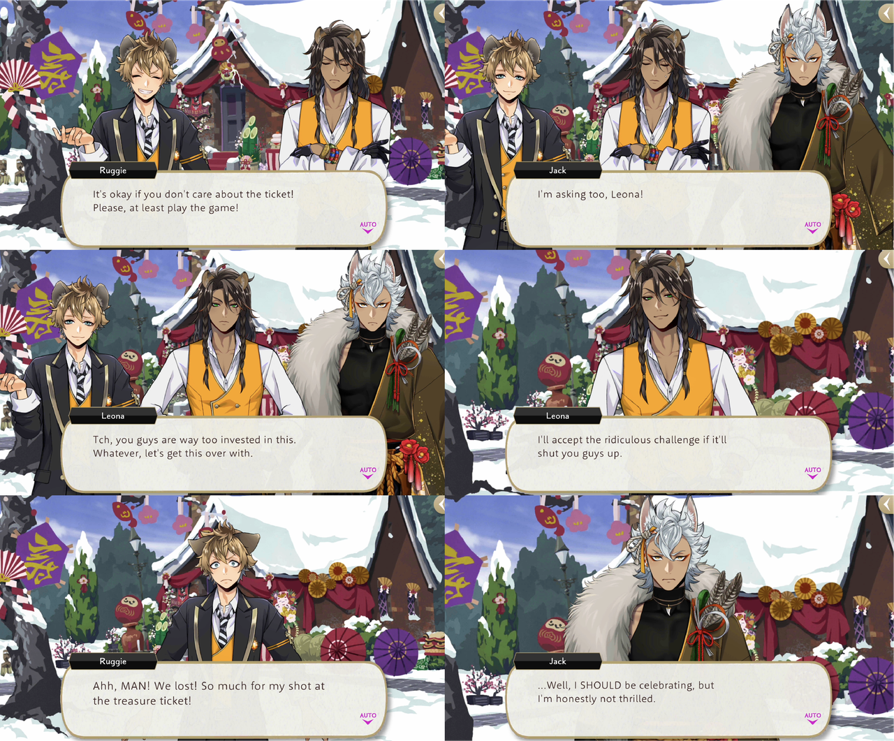 Leona initially refuses to do the “hanetsuki challenge” of New Year’s despite having spent enough money to be eligible, only reluctantly acquiescing when Jack says, “I’m asking you to do this one—for me.”