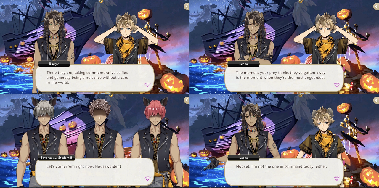 During Halloween Leona decides to get refreshments for the students of Savanclaw (Kalim: “I know Jack’s been working hard as part of the management committee”), downplaying himself with, “I’m lucky their brains are in their stomachs. Makes payroll as simple as can be.” Ruggie responds, “Can’t you just admit you wanna do something nice?”