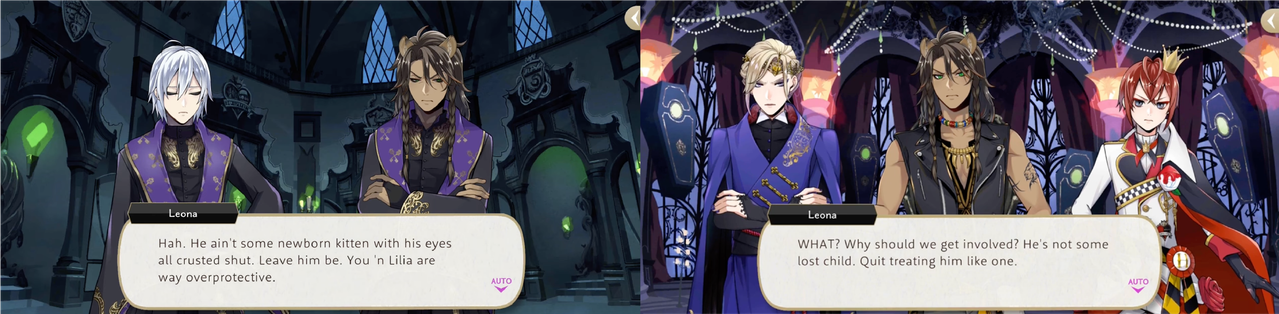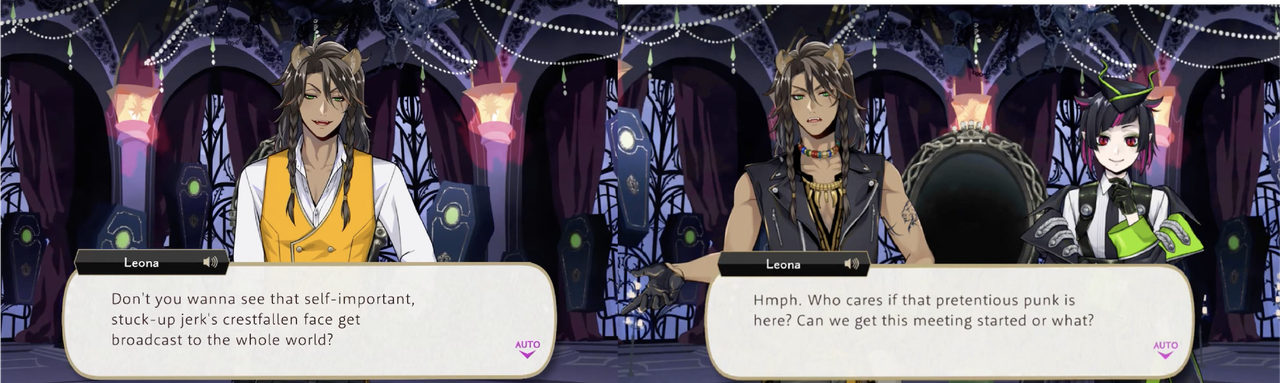 Leona will insult Malleus equally to his face and behind his back: during Housewarden meetings leona will refer to Malleus as a “self-important, stuck-up jerk” and “pretentious punk,” and when Malleus’ reports that his magic gets cut off in the hinterlands of the NBC event Leona responds, “Here I was hoping (Malleus would) finally be useful for a change.”