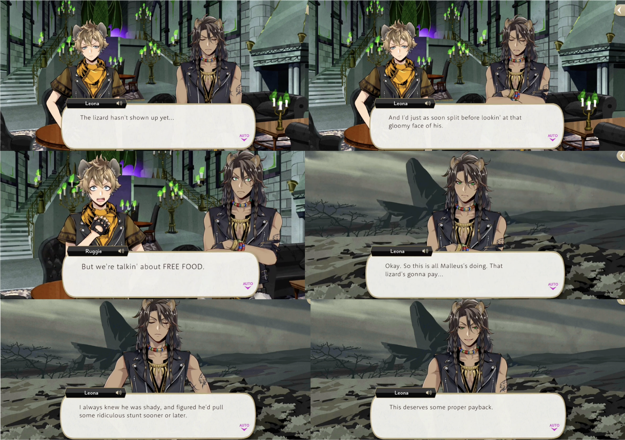 Leona tries to excuse himself early from Lilia’s farewell party because “the lizard hasn’t shown up yet, and (he’d) just as soon split before looking at that gloomy face of his,” but Ruggie refuses to leave the free food.