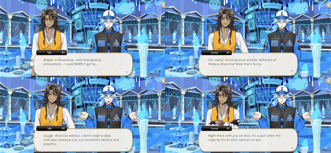 When Idia says that he might be able to get by in Diasomnia were he to transfer dorms Leona asks, “You’d become another adherent of Malleus Draconia?,” but Idia says it would be tedious and he doesn’t need to deal with peer pressure just because someone is famous and powerful.