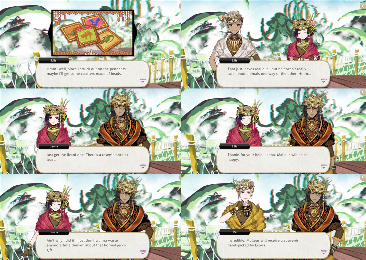 Lilia struggles to pick out an animal-motif coaster souvenir for Malleus during the event and it is Leona who recommends what he ultimately purchases: a lizard (Vil: “Incredible. Malleus will receive a souvenir hand-picked by Leona”).