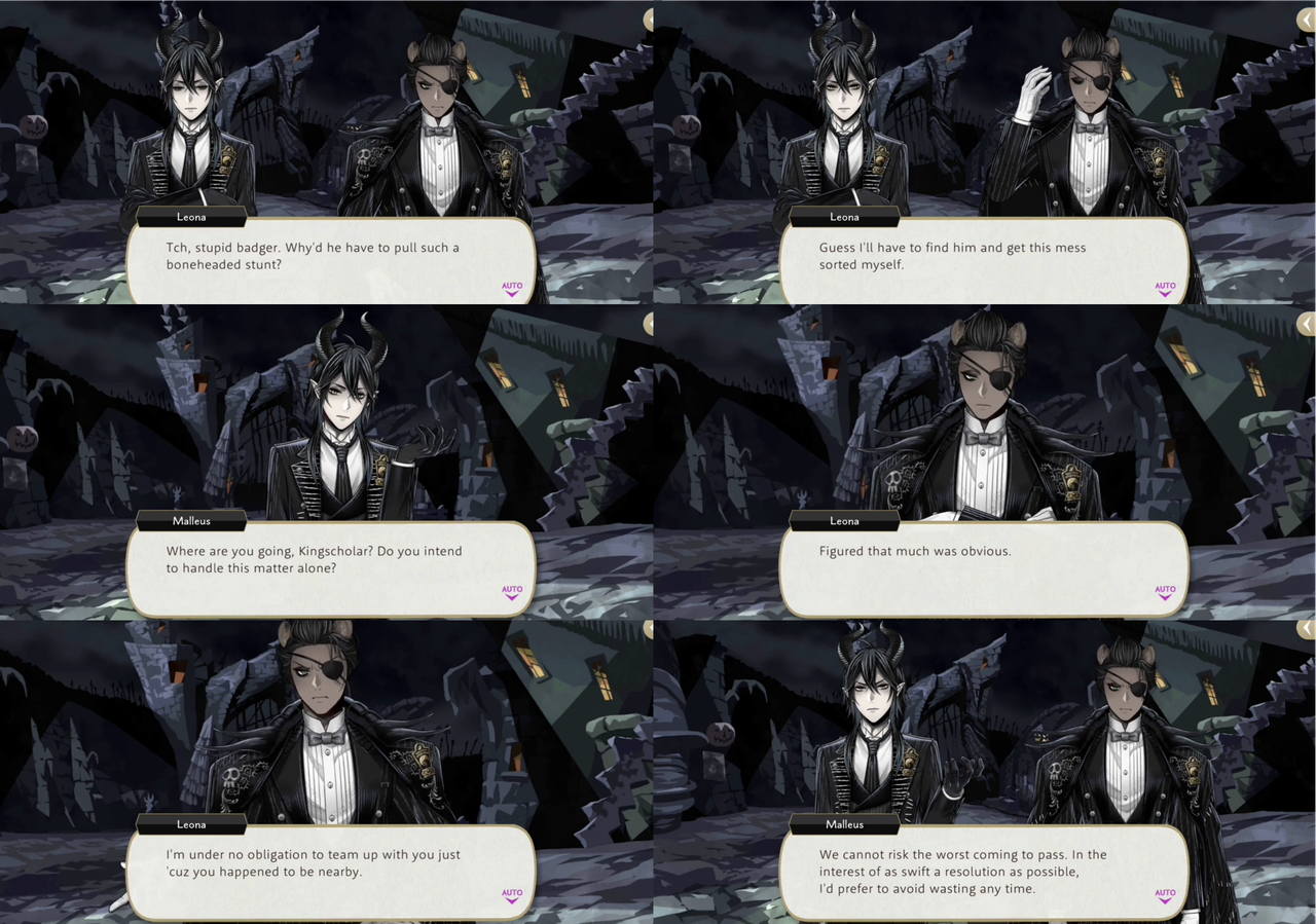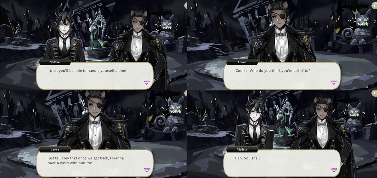 Malleus excuses himself to speak with Trey (“I believe he and I have…much to discuss”), telling Leona, “I trust you’ll be able to handle yourself alone?,” and Leona responds, “Who do you think you’re talkin’ to? Just tell Trey that once we get back, I wanna have a word with him too.” Malleus says, “Heh. So I shall.”