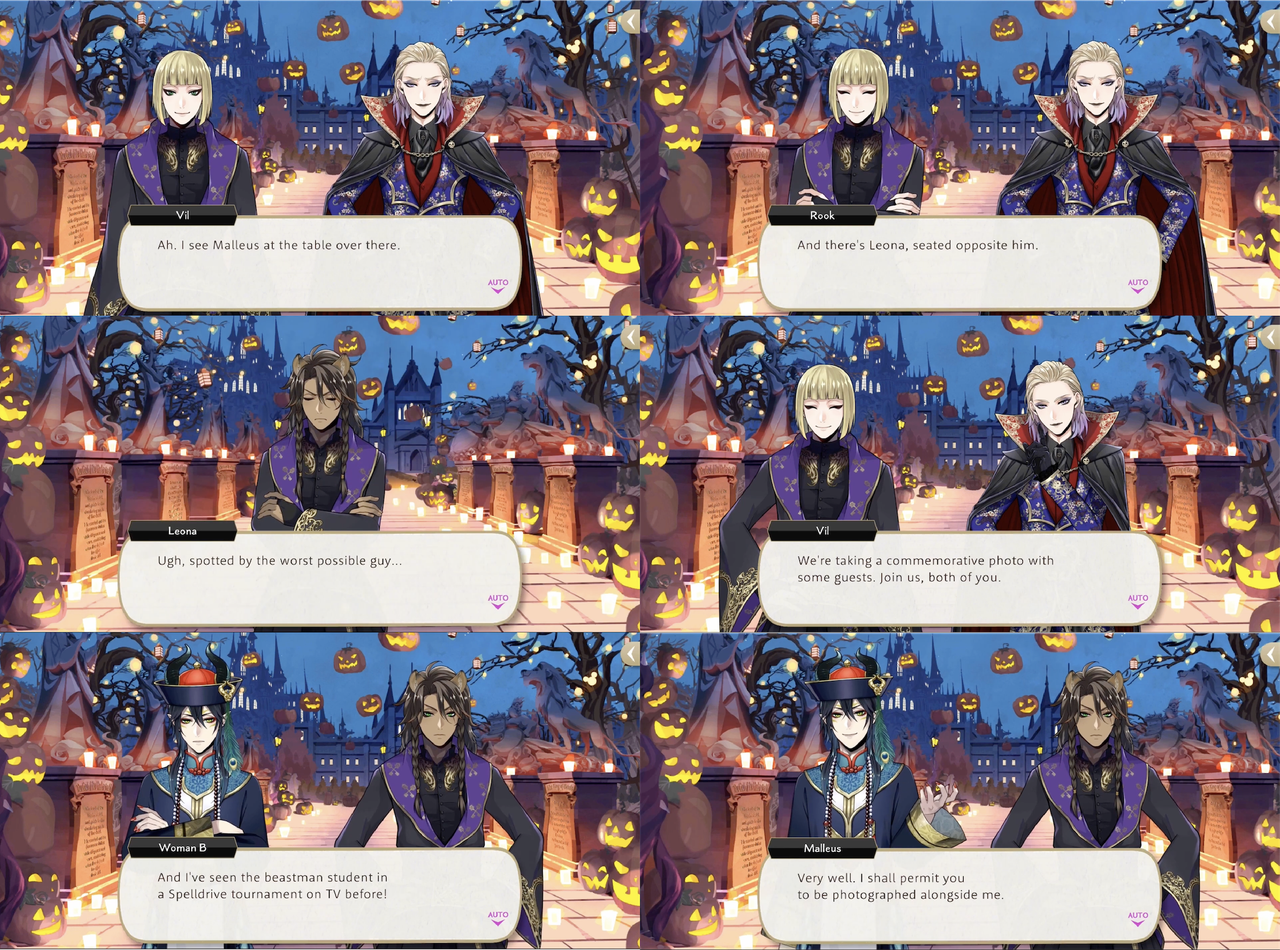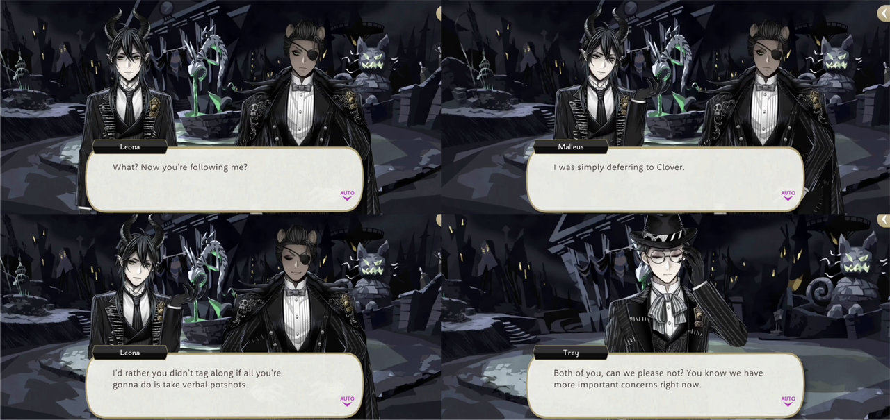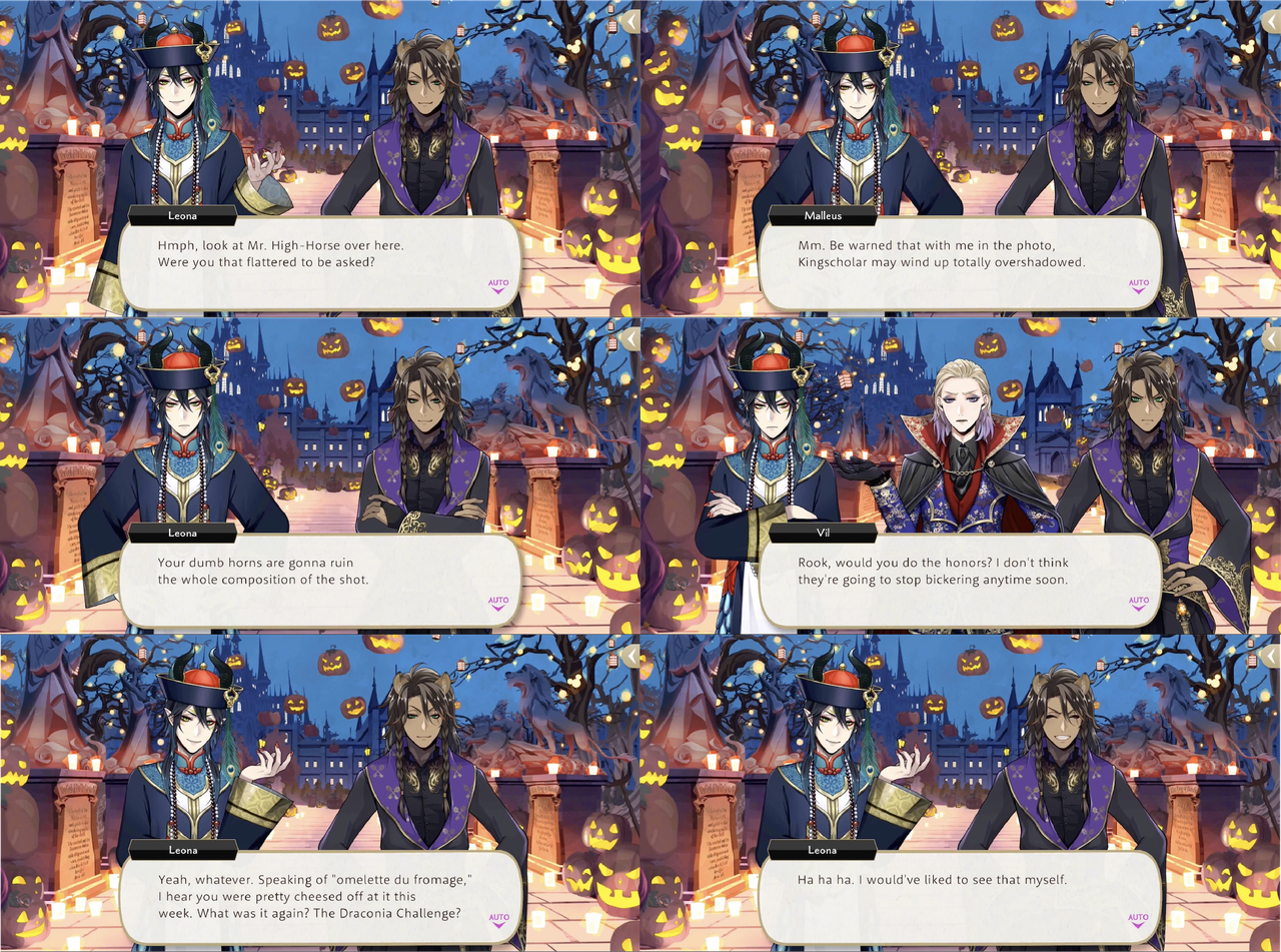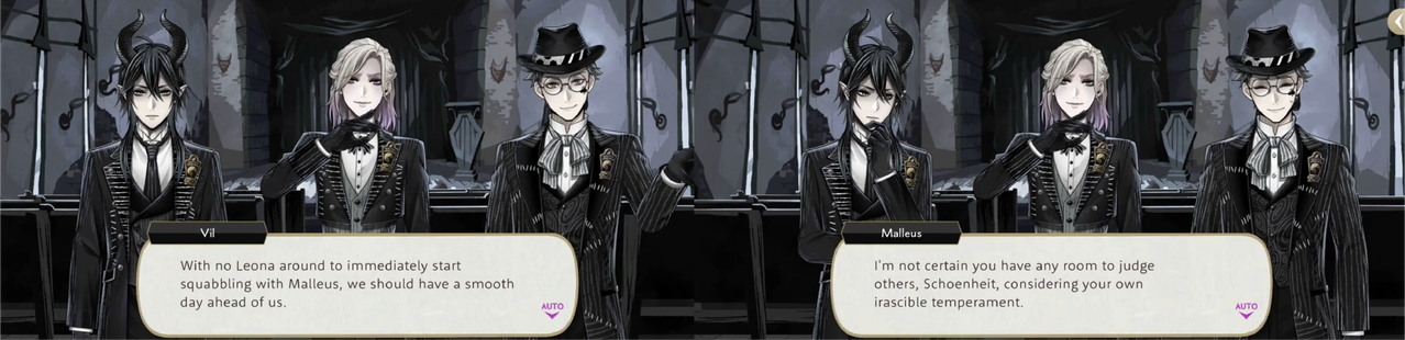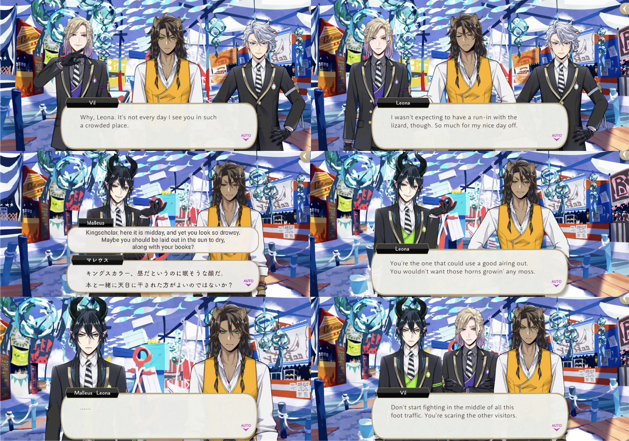 Leona and Malleus begin bickering immediately at the start of NBC, with Vil again interrupting and telling them not to start fighting as they are scaring other visitors.