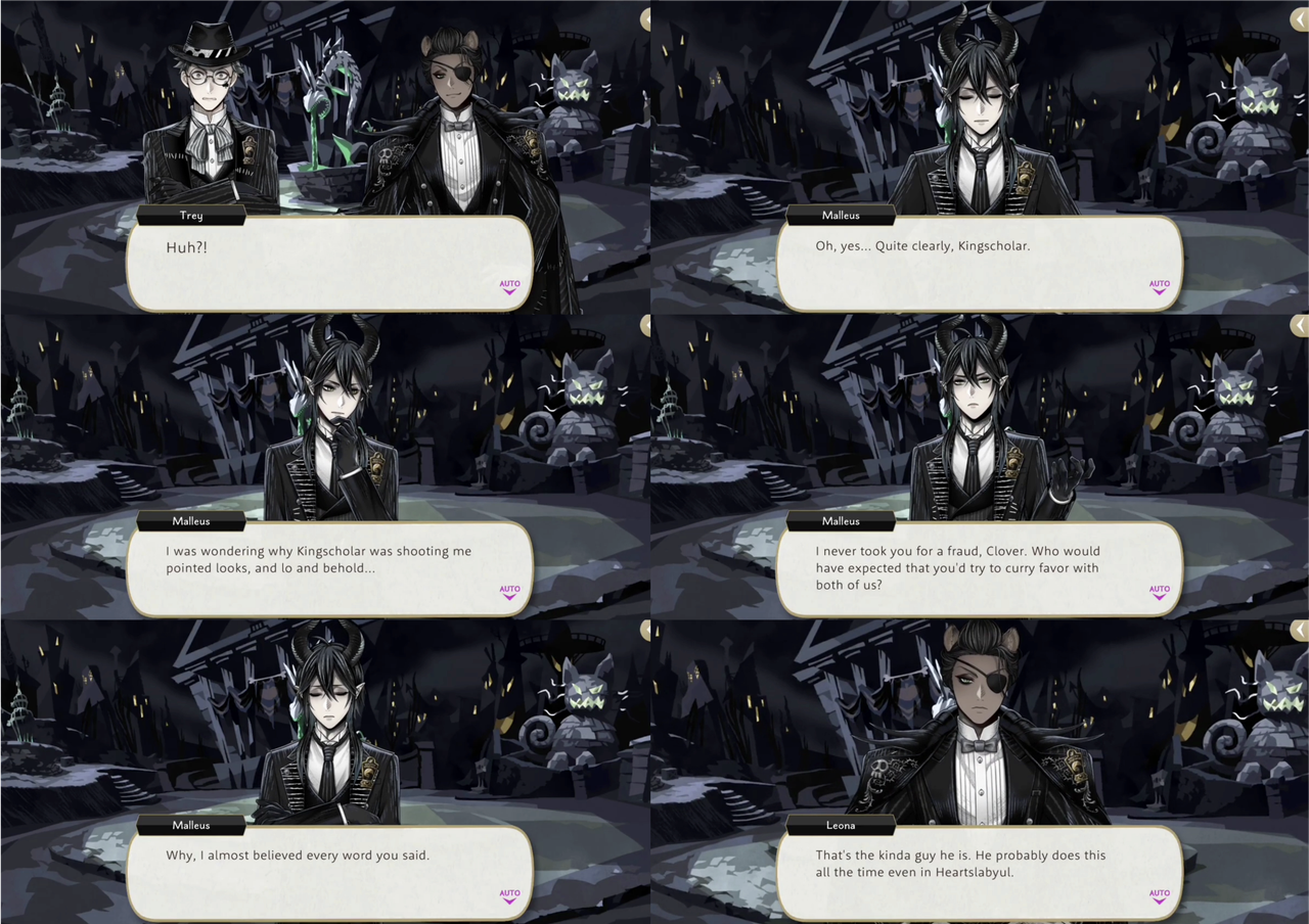 Malleus says, “I was wondering why Kingscholar was shooting me pointed looks, and lo and behold…I never took you for a fraud, Clover. Who would have expected that you’d try to curry favor with both of us?,” Leona having called Malleus over to reveal Trey’s act.