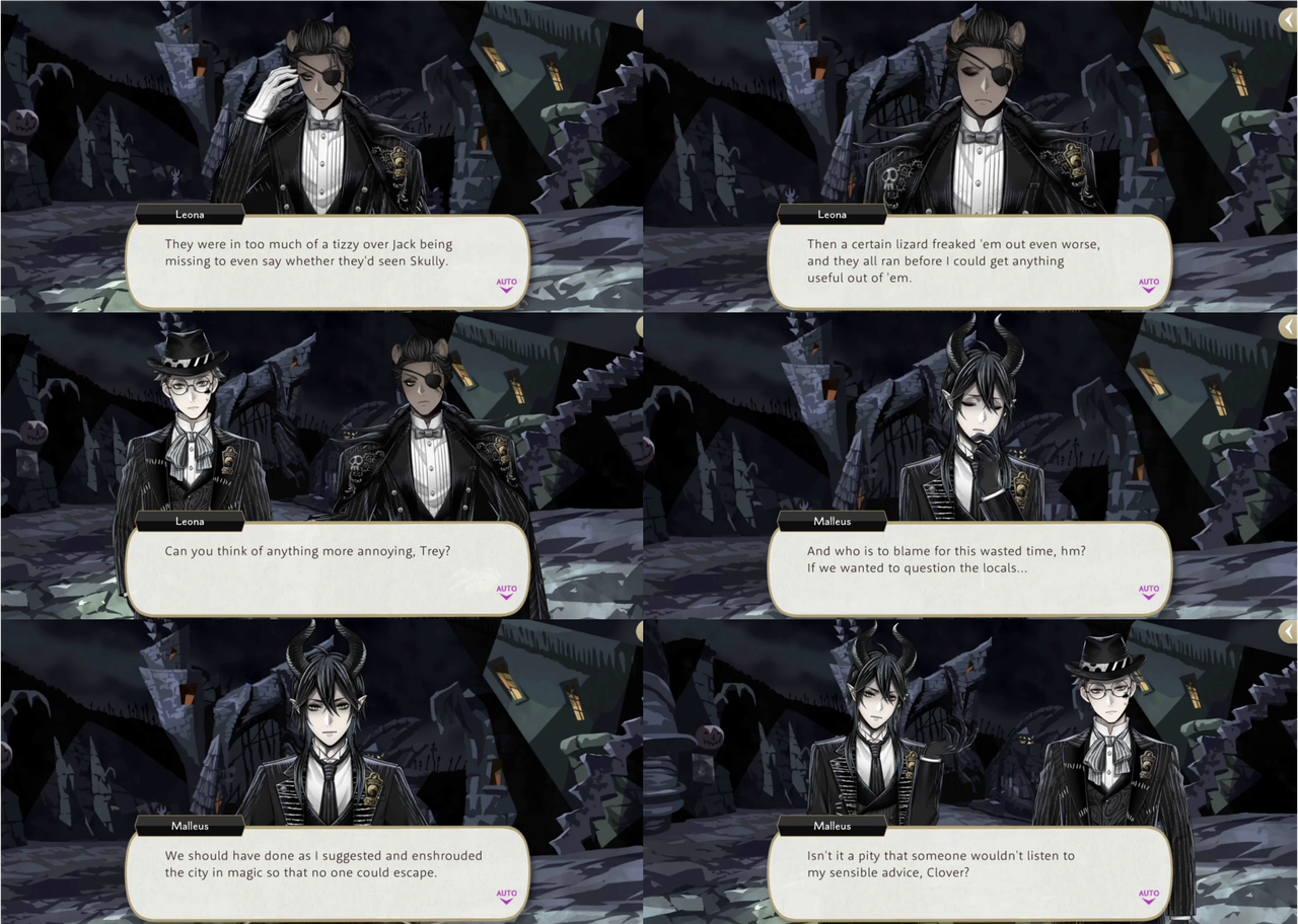 Malleus and Leona end up together with Trey after Skully has kidnappd Jack Skellington, with Leona deciding to go off alone (“I’m under no obligation to team up with you just ‘cuz you happened to be nearby”).
