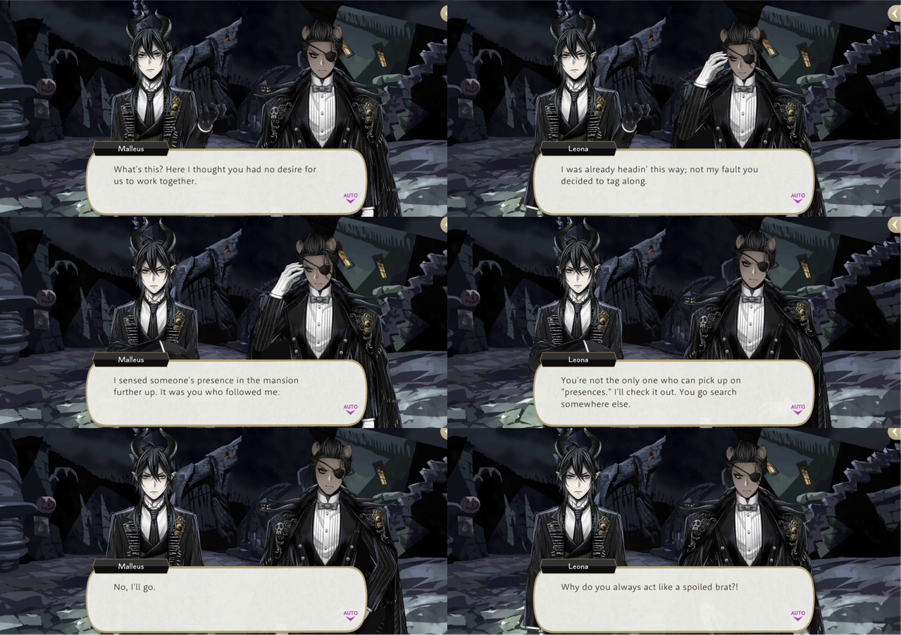 Malleus and Leona are often bickering (often instigated by Leona), with Idia asking during Fairy Gala IF, “Don’t you guys ever get tired of sniping at each other?”