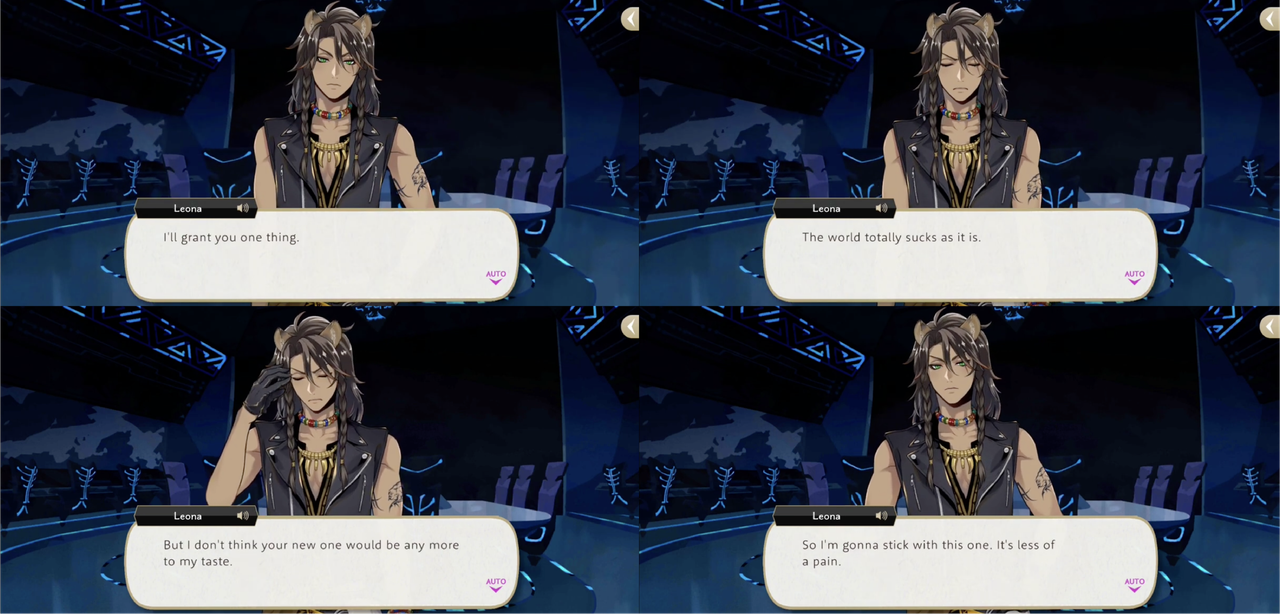 After Ortho explains his and Idia’s plans to reset the world and start a new game Leona says, “The world totally sucks as it is. But I don’t think your new one would be any more to my taste. So I’m gonna stick with this one. It’s less of a pain.”