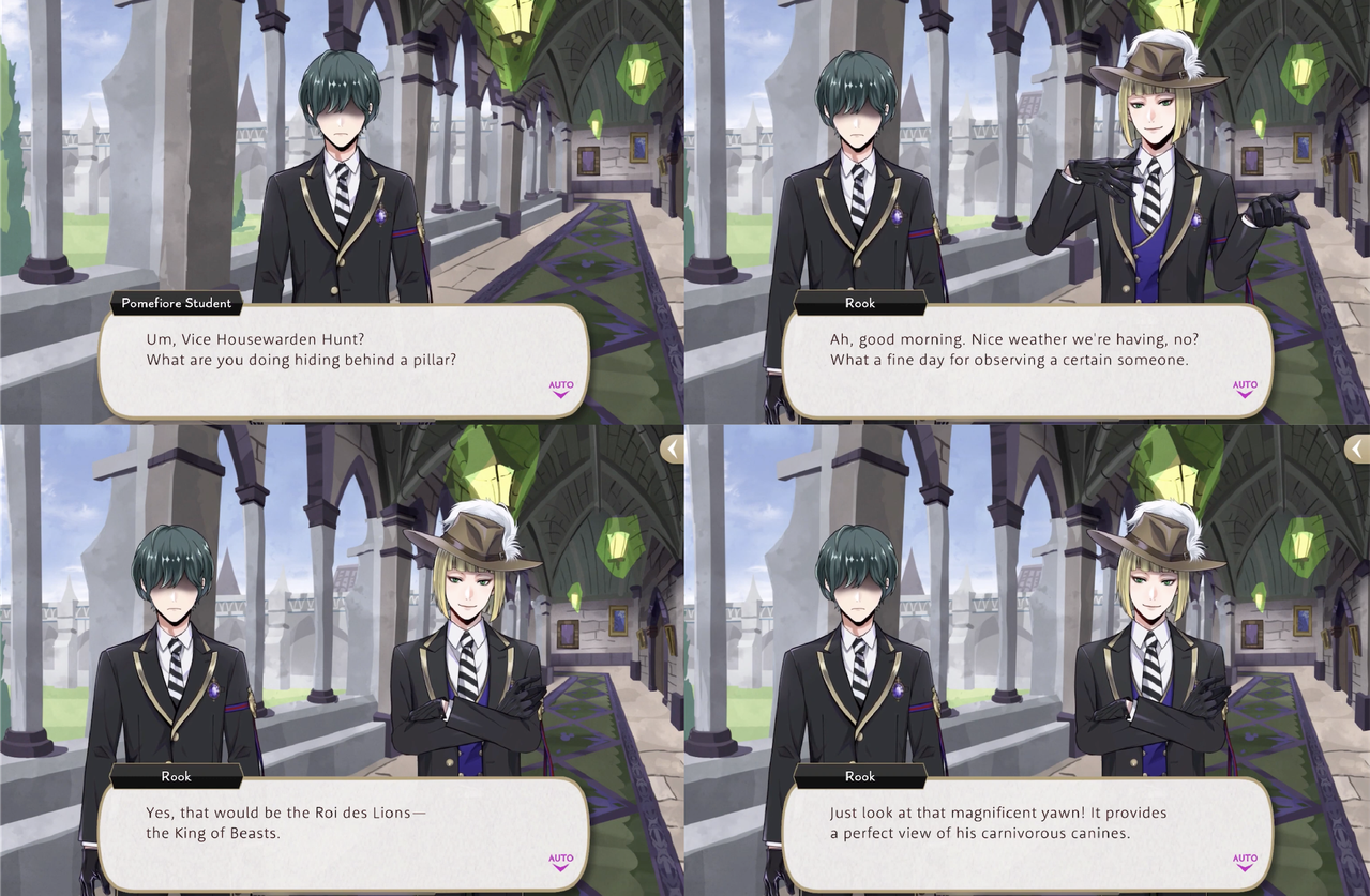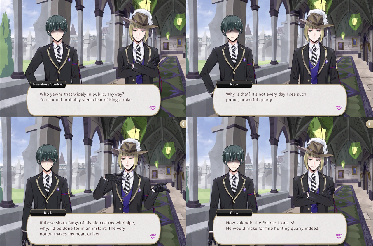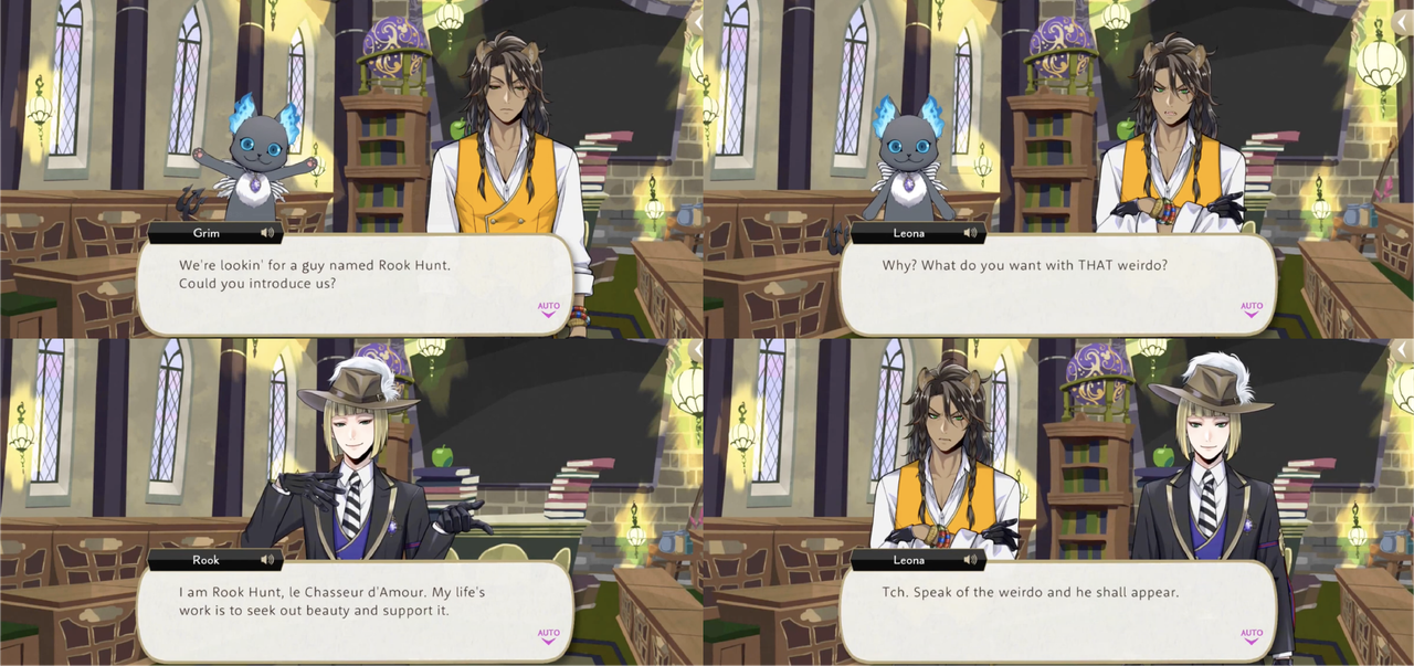 Leona will refer to Rook as a “weirdo” and “creepy,” and we get an idea maybe of why in a vignette where we see Rook hiding behind a pillar to watch Leona in the school’s courtyard (Rook: “If those sharp fangs of his pierced my windpipe, why, l’d be done for in an instant. The very notion makes my heart quiver”).