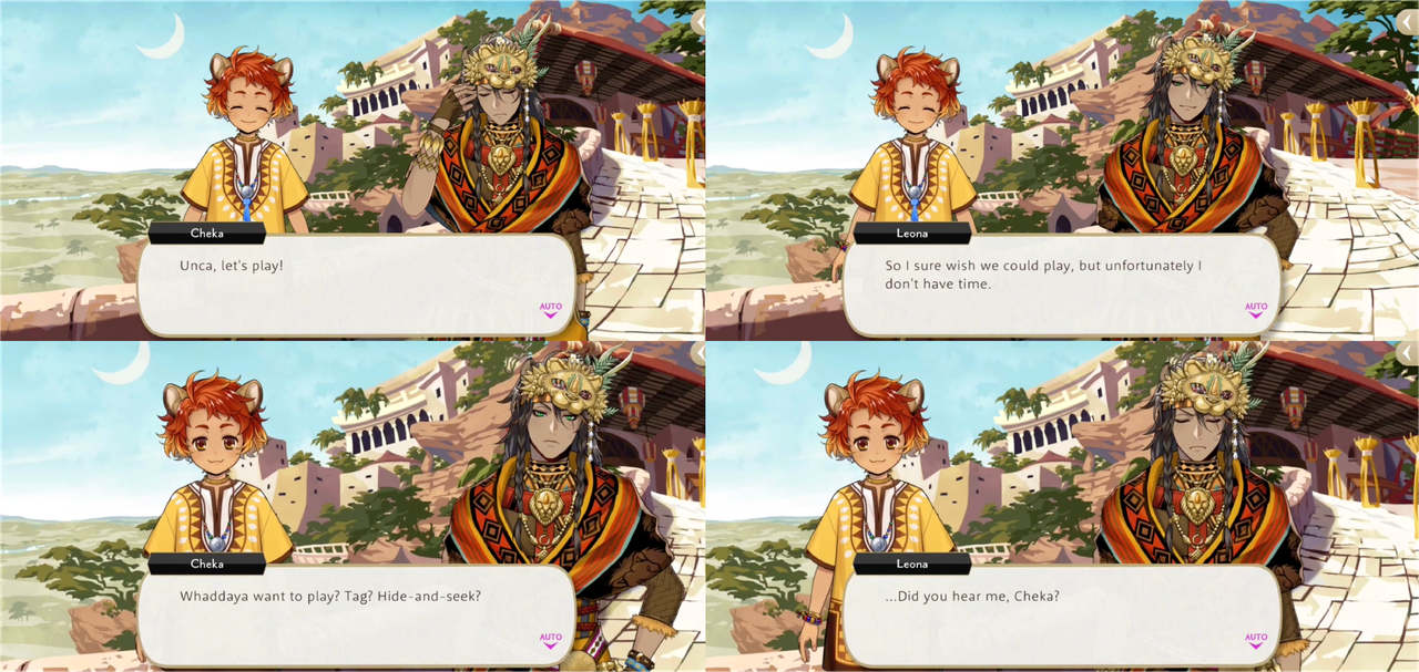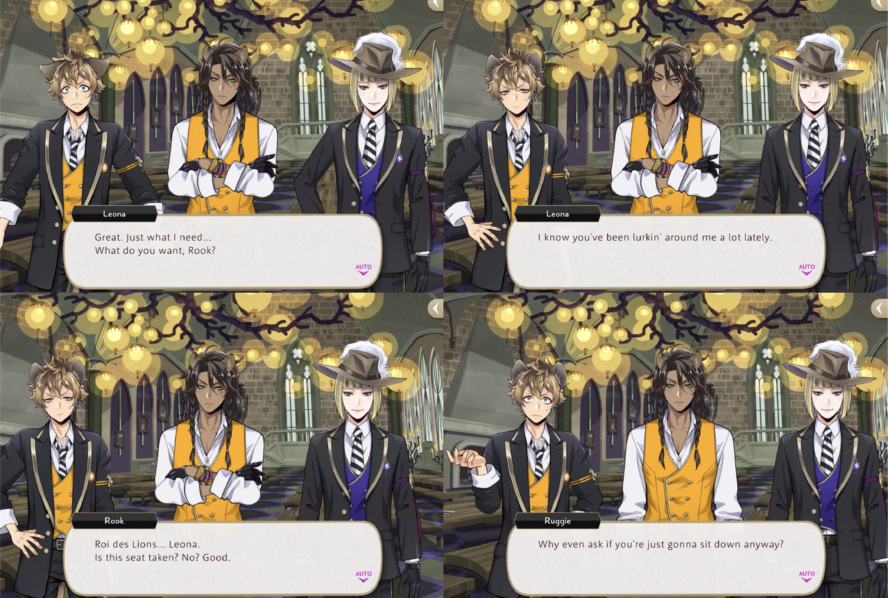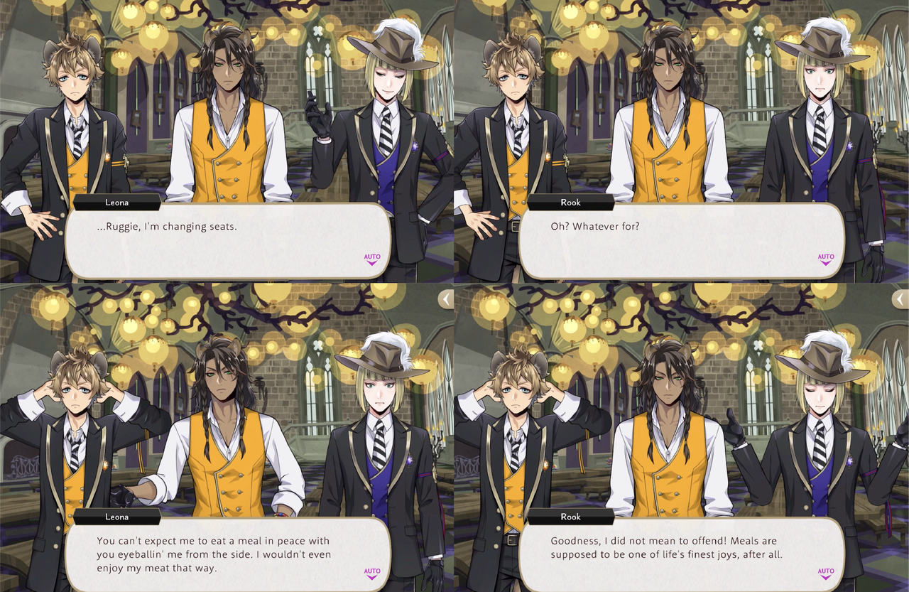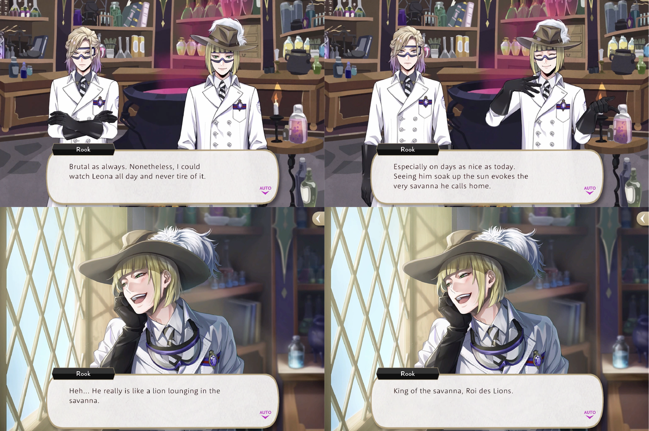 Leona will refer to Rook as a “weirdo” and “creepy,” and we get an idea maybe of why in a vignette where we see Rook hiding behind a pillar to watch Leona in the school’s courtyard (Rook: “If those sharp fangs of his pierced my windpipe, why, l’d be done for in an instant. The very notion makes my heart quiver”).