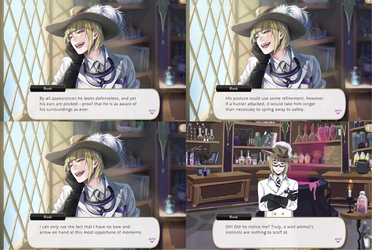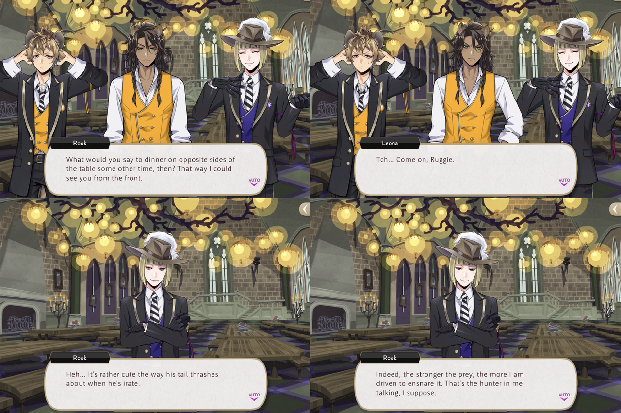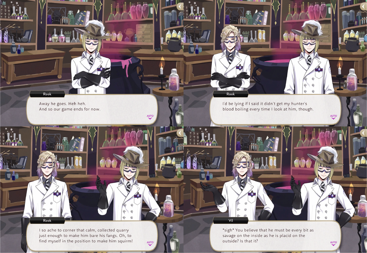 Vil is not impressed as Rook explains, “I’d be lying if I said it didn’t get my hunter’s blood boiling every time I look at him,” and “I so ache to corner that calm, collected quarry just enough to make him bare his fangs. Oh, to find myself in the position to make him squirm!”