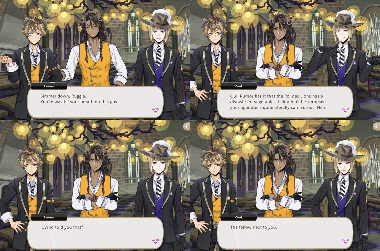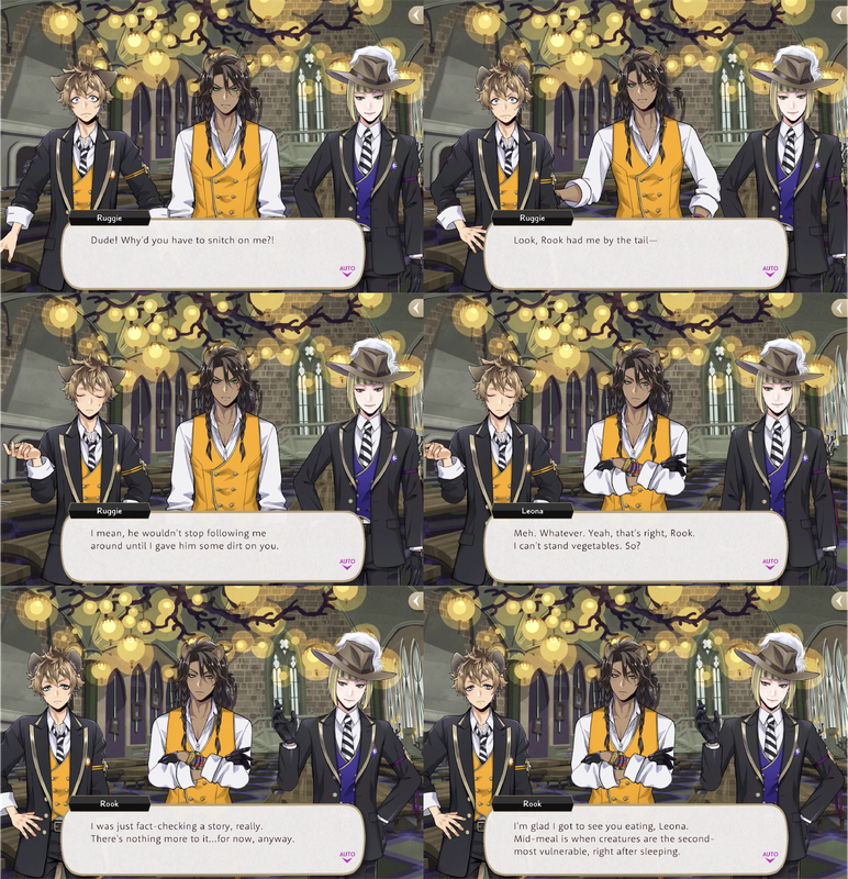 Rook approaches Leona directly in the cafeteria, inviting himself to sit at Leona’s table and revealing that he was able to coerce Ruggie into betraying to him the fact that Leona does not like vegetables.