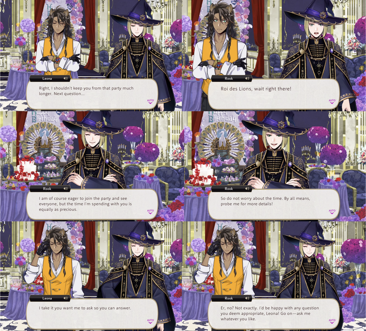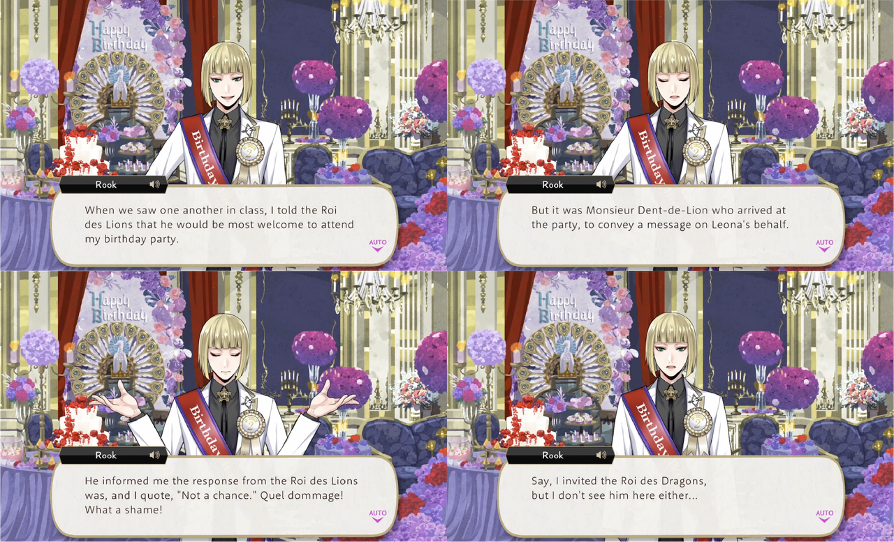 Neither Rook nor Malleus attend Rook’s birthday party despite being invited, and Rook tells a story from the previous year’s Beanfest where they caught Rook between them and managed to take him down despite quarreling with one another at the time.