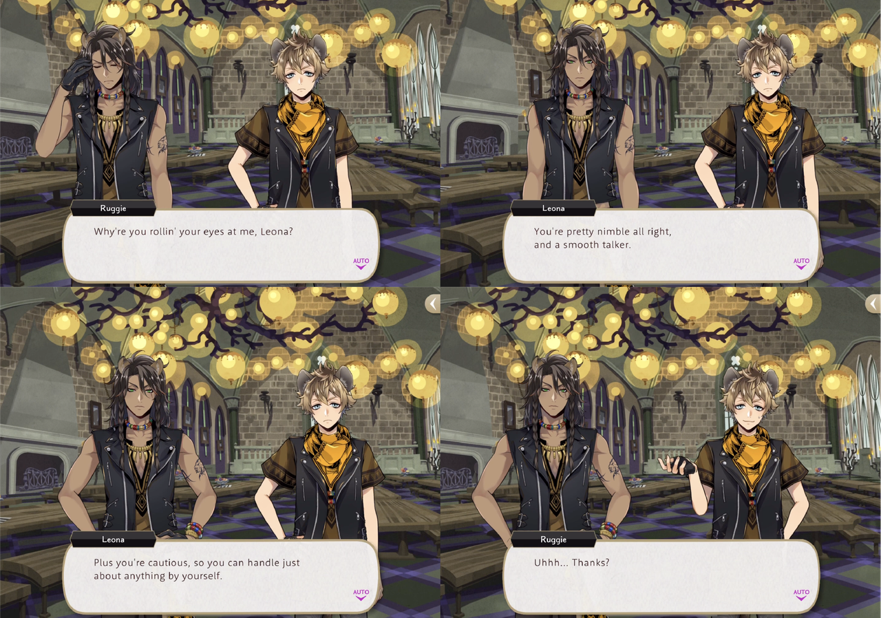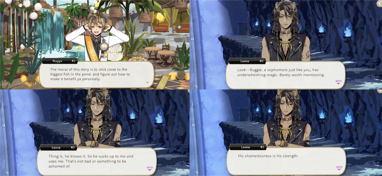 Ruggie says that the moral of his story is “stick close to the biggest fish in the pond, and figure out how to make it benefit ya personally,” but Leona seems wholly aware that he is being used in this way, saying that Ruggie knows his limitations and “So he sucks up to me and uses me. That’s not bad or something to be ashamed of. His shamelessness is his strength.”