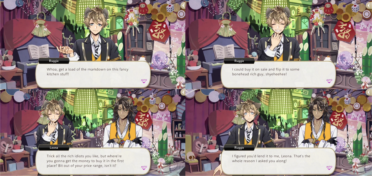 Ruggie asks Leona to go along with him to the school store during New Year’s specifically so that Leona will buy him things that he cannot afford even on sale, and then resell them to others for profit.