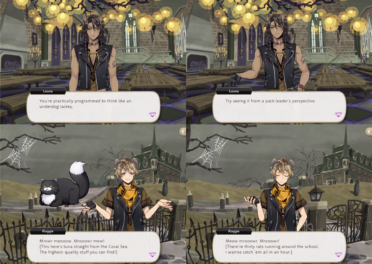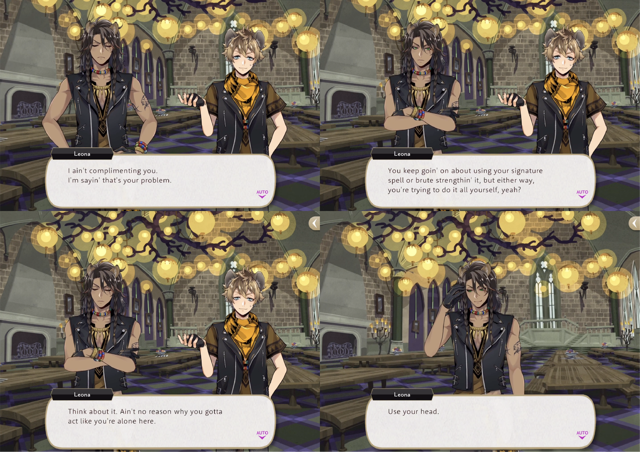 We see an example of Leona giving advice to Ruggie in a vignette where Ruggie has been assigned to catch escaped rats for Trein, which he struggles to do alone despite his animal linguistics skills.