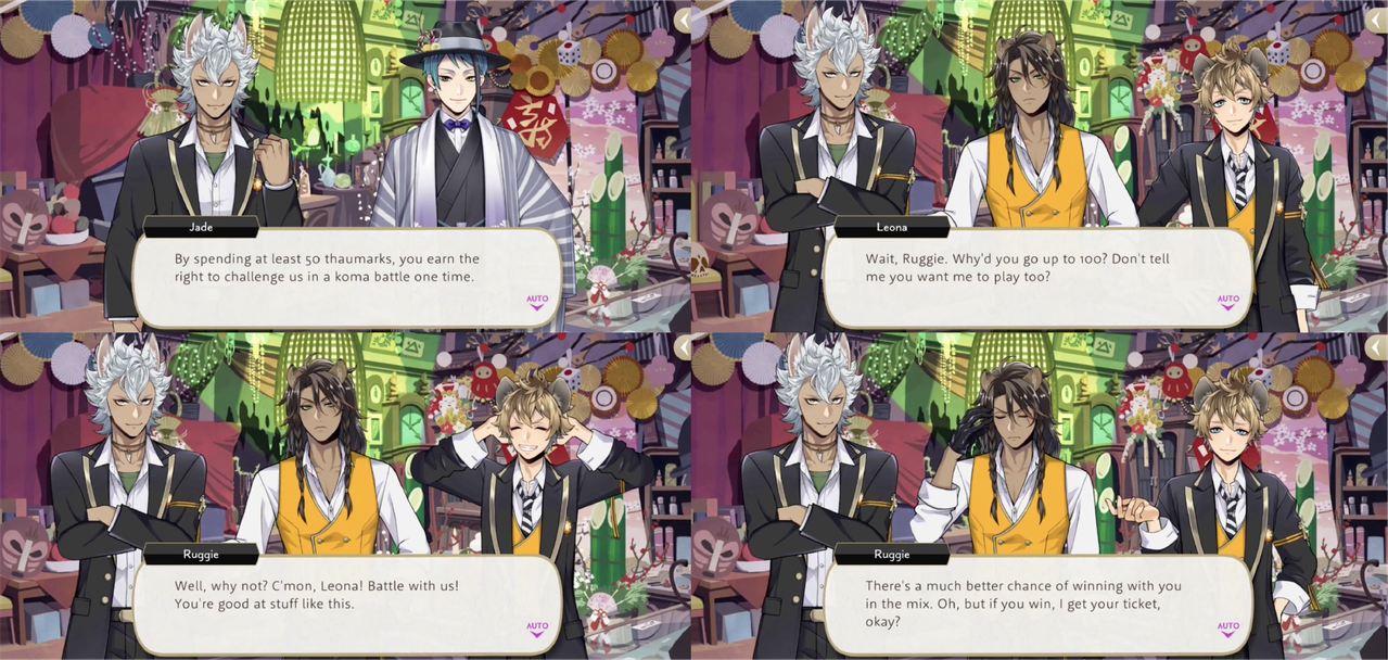 Leona is not pleased by the expectation that he join in a koma battle, but Ruggie convinces him to join (“Oh, but if you win, I get your ticket, okay?”)
