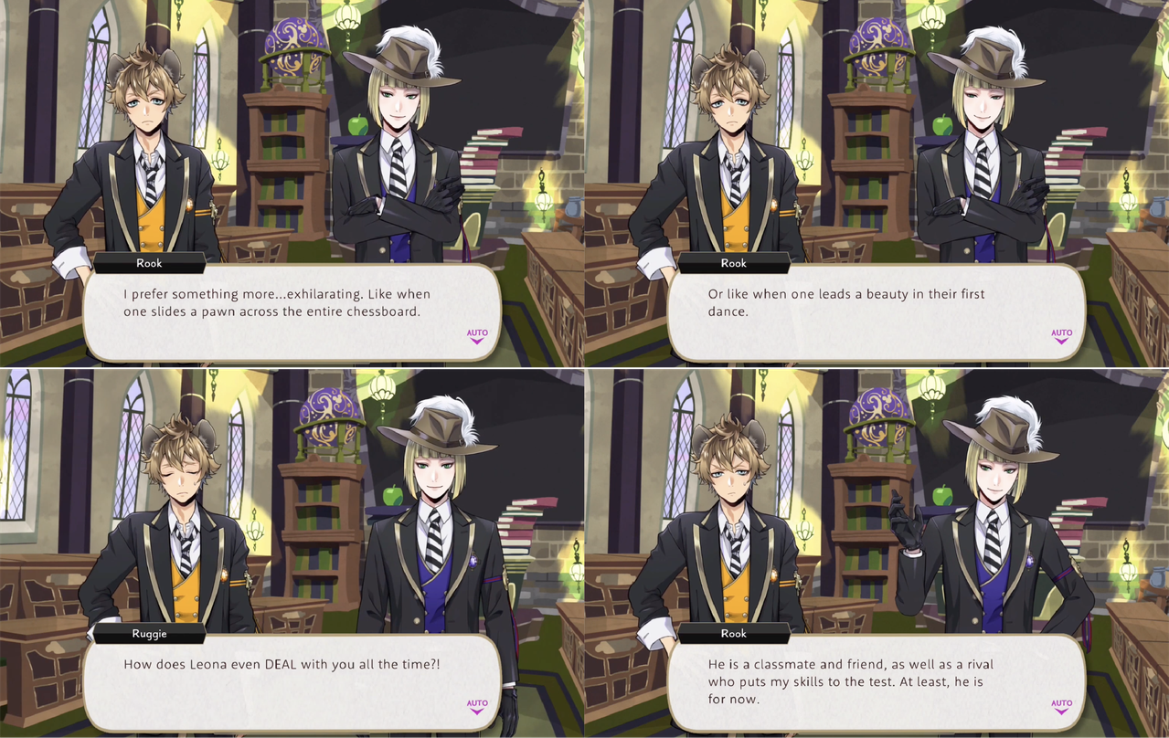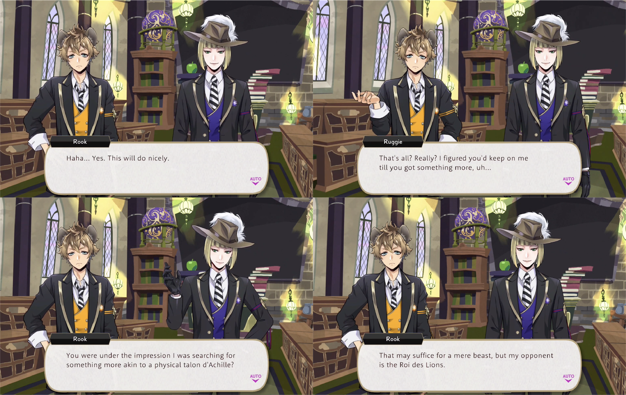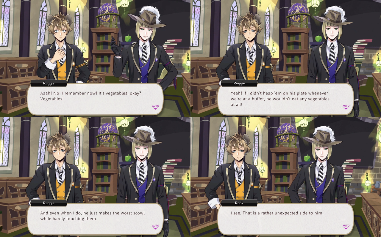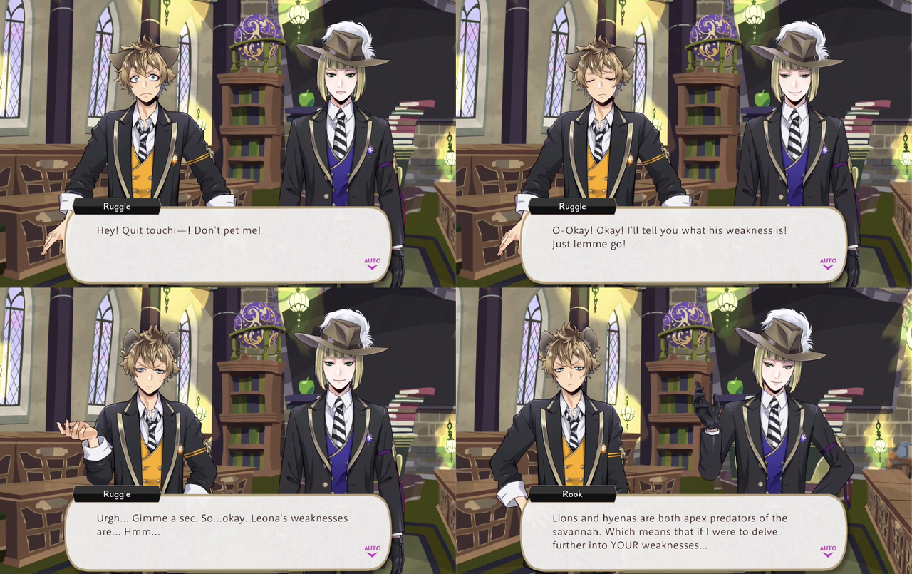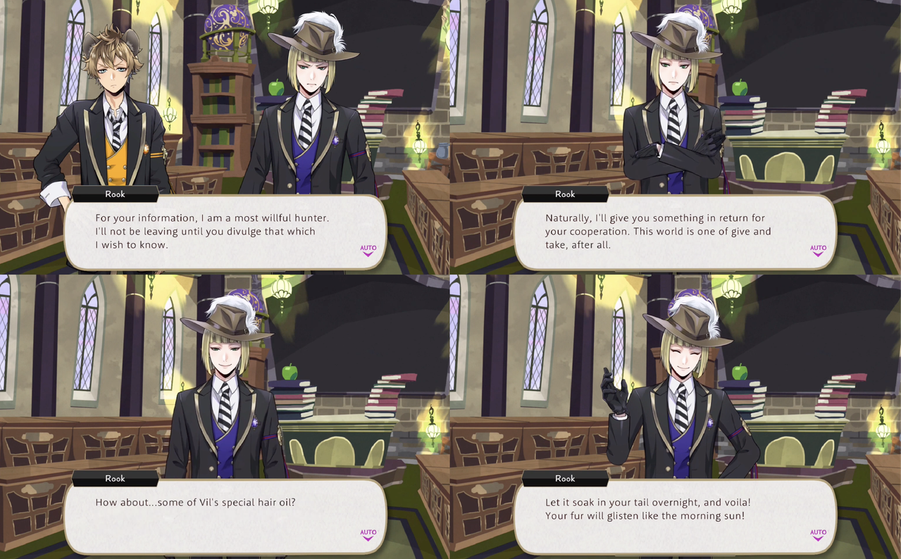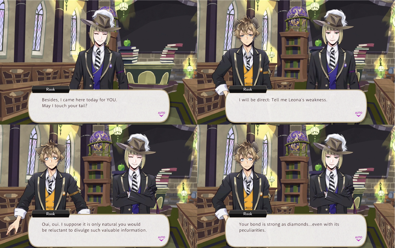 Rook demands that Ruggie tell him Leona’s weakness (”I’ll not be leaving until you divulge that which I wish to know”) despite Ruggie’s refusal to cooperate, using “special hair oil” crafted by Vil as a bribe and petting Ruggie’s tail despite Ruggie’s resistance.