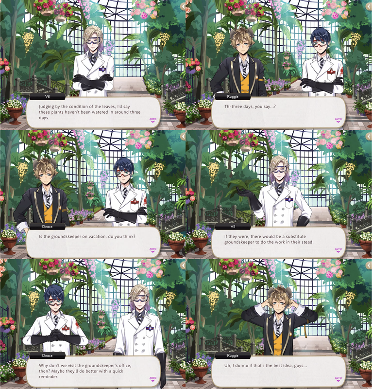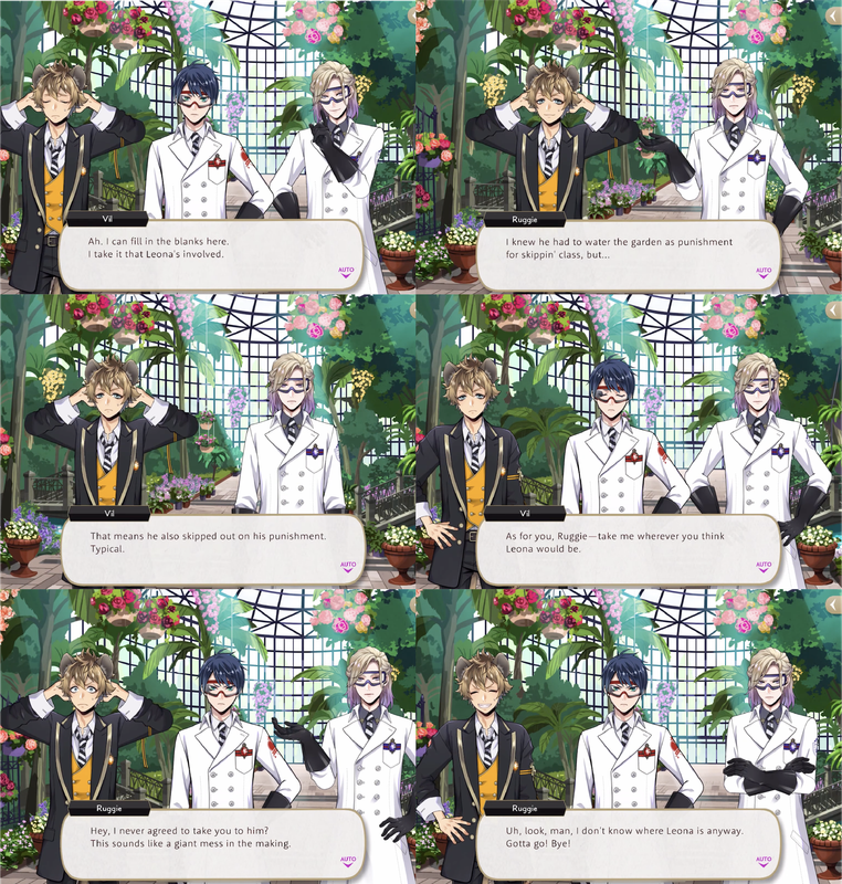 When Vil orders Ruggie to take him to Leona so that he might confront Leona over his failure to fulfill his punishment of watering the plants in the botanical garden Ruggie refuses, even running away to escape.