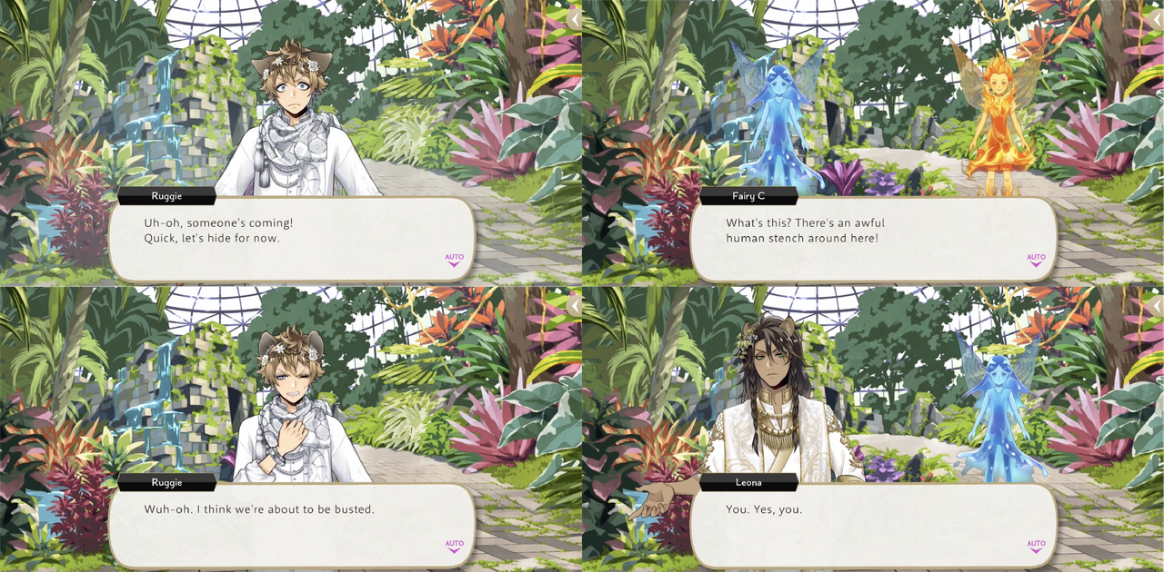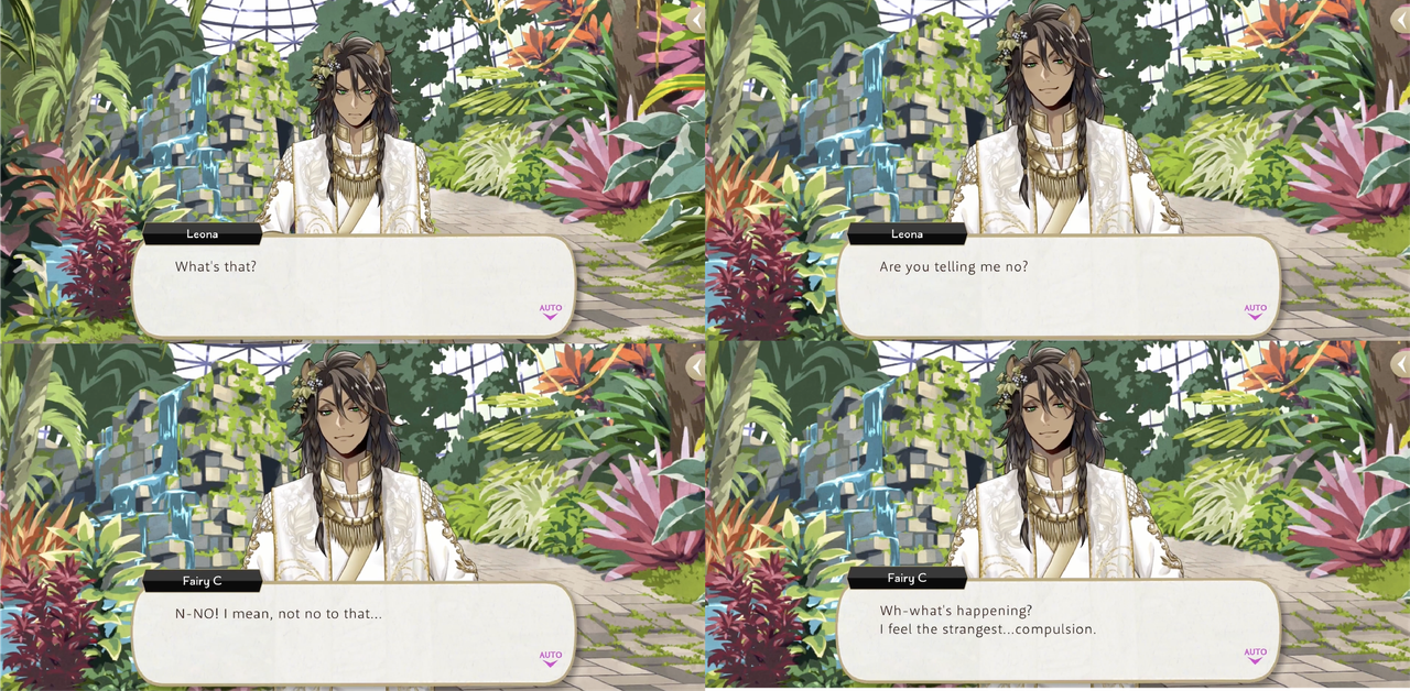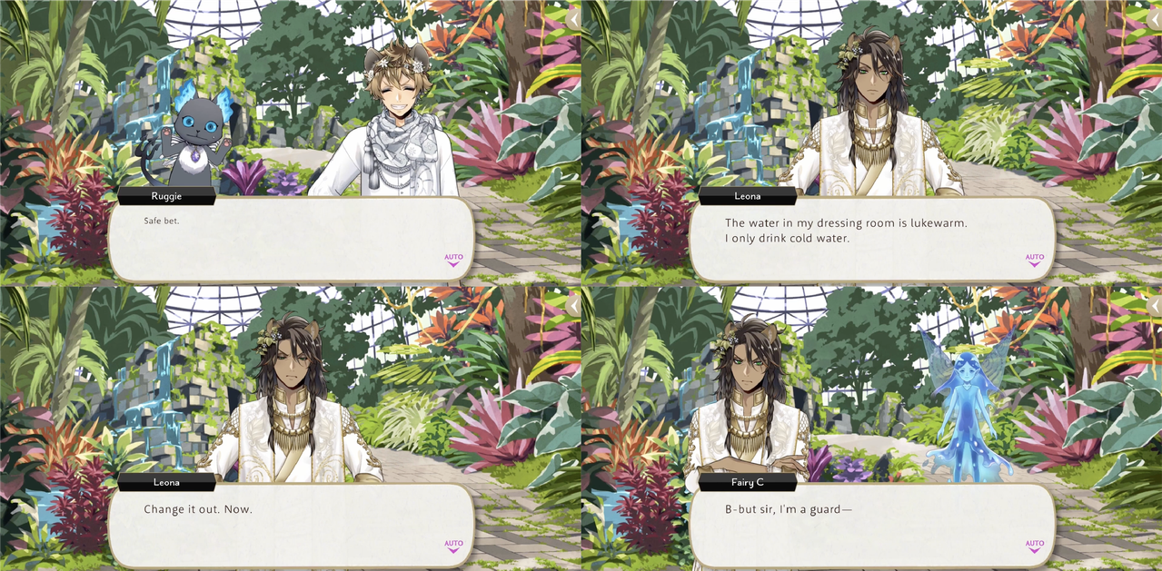 Ruggie is not pleased about being put into danger for Leona’s plan but Leona assures him he is there to protect him and the others, which we then see him do: when Ruggie and the others are in danger of being caught by fairy guards Leona intercepts and insists that they keep their eyes on him, demanding cold water for his dressing room and refusing to take “no” for an answer (Fairy: “Wh-what’s happening? I feel the strangest…compulsion”).